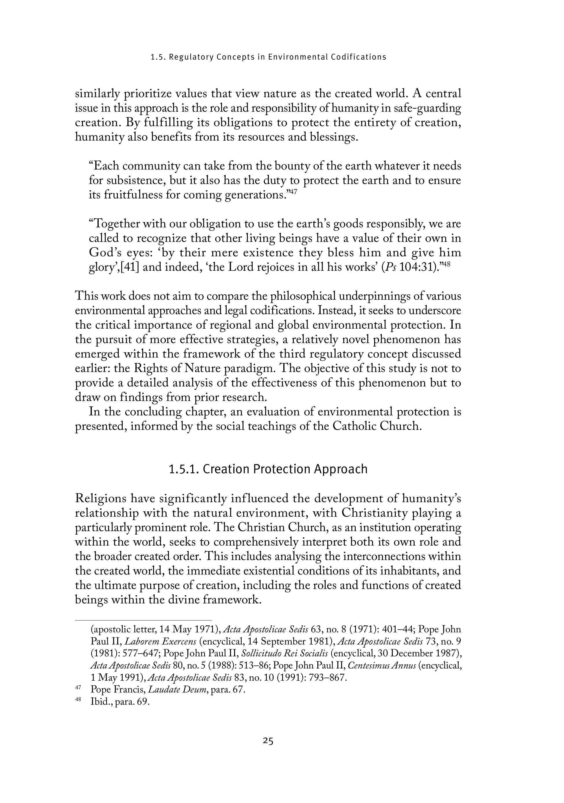 1.5. Regulatory Concepts in Environmental Codifications similarly prioritize values that view nature as the created world. A central issue in this approach is the role and responsibility of humanity in safe-guarding creation. By fulfilling its obligations to protect the entirety of creation, humanity also benefits from its resources and blessings. “Each community can take from the bounty of the earth whatever it needs for subsistence, but it also has the duty to protect the earth and to ensure its fruitfulness for coming generations.” “Together with our obligation to use the earth’s goods responsibly, we are called to recognize that other living beings have a value of their own in God’s eyes: ‘by their mere existence they bless him and give him glory’,[41] and indeed, ‘the Lord rejoices in all his works’ (Ps 104:31).”* This work does not aim to compare the philosophical underpinnings of various environmental approaches and legal codifications. Instead, it seeks to underscore the critical importance of regional and global environmental protection. In the pursuit of more effective strategies, a relatively novel phenomenon has emerged within the framework of the third regulatory concept discussed earlier: the Rights of Nature paradigm. The objective of this study is not to provide a detailed analysis of the effectiveness of this phenomenon but to draw on findings from prior research. In the concluding chapter, an evaluation of environmental protection is presented, informed by the social teachings of the Catholic Church. 1.5.1. Creation Protection Approach Religions have significantly influenced the development of humanity’s relationship with the natural environment, with Christianity playing a particularly prominent role. The Christian Church, as an institution operating within the world, seeks to comprehensively interpret both its own role and the broader created order. This includes analysing the interconnections within the created world, the immediate existential conditions of its inhabitants, and the ultimate purpose of creation, including the roles and functions of created beings within the divine framework. (apostolic letter, 14 May 1971), Acta Apostolicae Sedis 63, no. 8 (1971): 401-44; Pope John Paul II, Laborem Exercens (encyclical, 14 September 1981), Acta Apostolicae Sedis 73, no. 9 (1981): 577-647; Pope John Paul II, Solicitudo Rei Socialis (encyclical, 30 December 1987), Acta Apostolicae Sedis 80, no. 5 (1988): 513-86; Pope John Paul IT, Centesimus Annus (encyclical, 1 May 1991), Acta Apostolicae Sedis 83, no. 10 (1991): 793-867. Pope Francis, Laudate Deum, para. 67. 8 Tbid., para. 69. 47 25