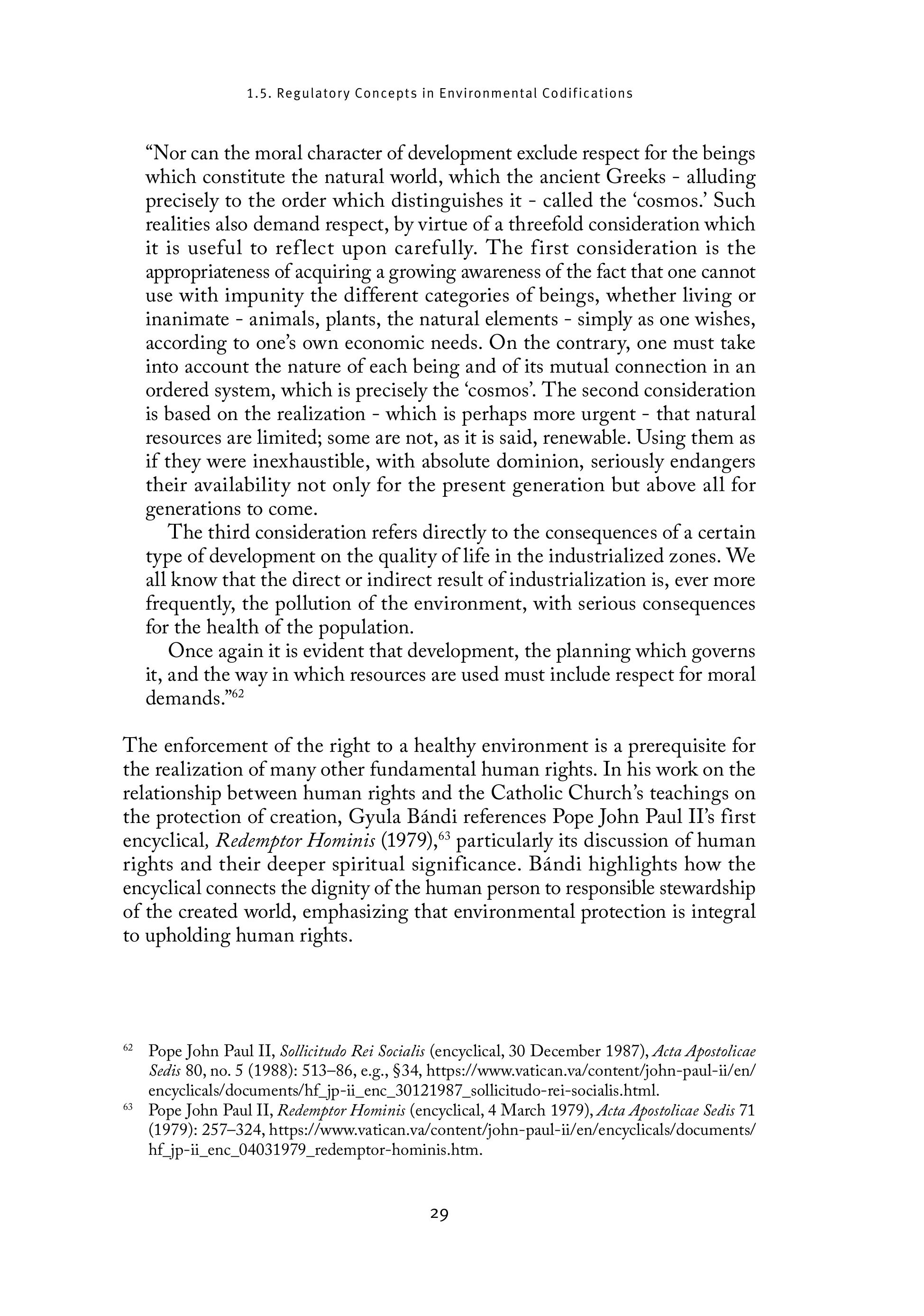 1.5. Regulatory Concepts in Environmental Codifications "Nor can the moral character of development exclude respect for the beings which constitute the natural world, which the ancient Greeks - alluding precisely to the order which distinguishes it - called the ‘cosmos.’ Such realities also demand respect, by virtue of a threefold consideration which it is useful to reflect upon carefully. The first consideration is the appropriateness of acquiring a growing awareness of the fact that one cannot use with impunity the different categories of beings, whether living or inanimate - animals, plants, the natural elements - simply as one wishes, according to one’s own economic needs. On the contrary, one must take into account the nature of each being and of its mutual connection in an ordered system, which is precisely the ‘cosmos’. The second consideration is based on the realization - which is perhaps more urgent - that natural resources are limited; some are not, as it is said, renewable. Using them as if they were inexhaustible, with absolute dominion, seriously endangers their availability not only for the present generation but above all for generations to come. The third consideration refers directly to the consequences of a certain type of development on the quality of life in the industrialized zones. We all know that the direct or indirect result of industrialization is, ever more frequently, the pollution of the environment, with serious consequences for the health of the population. Once again it is evident that development, the planning which governs it, and the way in which resources are used must include respect for moral demands.”* Pope John Paul II, Sollicitudo Rei Socialis (encyclical, 30 December 1987), Acta Apostolicae Sedis 80, no. 5 (1988): 513-86, e.g., §34, https://www.vatican.va/content/john-paul-ii/en/ encyclicals/documents/hf_jp-ii_enc_30121987_sollicitudo-rei-socialis.html. Pope John Paul II, Redemptor Hominis (encyclical, 4 March 1979), Acta Apostolicae Sedis 71 (1979): 257-324, https://www.vatican.va/content/john-paul-ii/en/encyclicals/documents/ hf_jp-ii_enc_04031979_redemptor-hominis.htm. 29