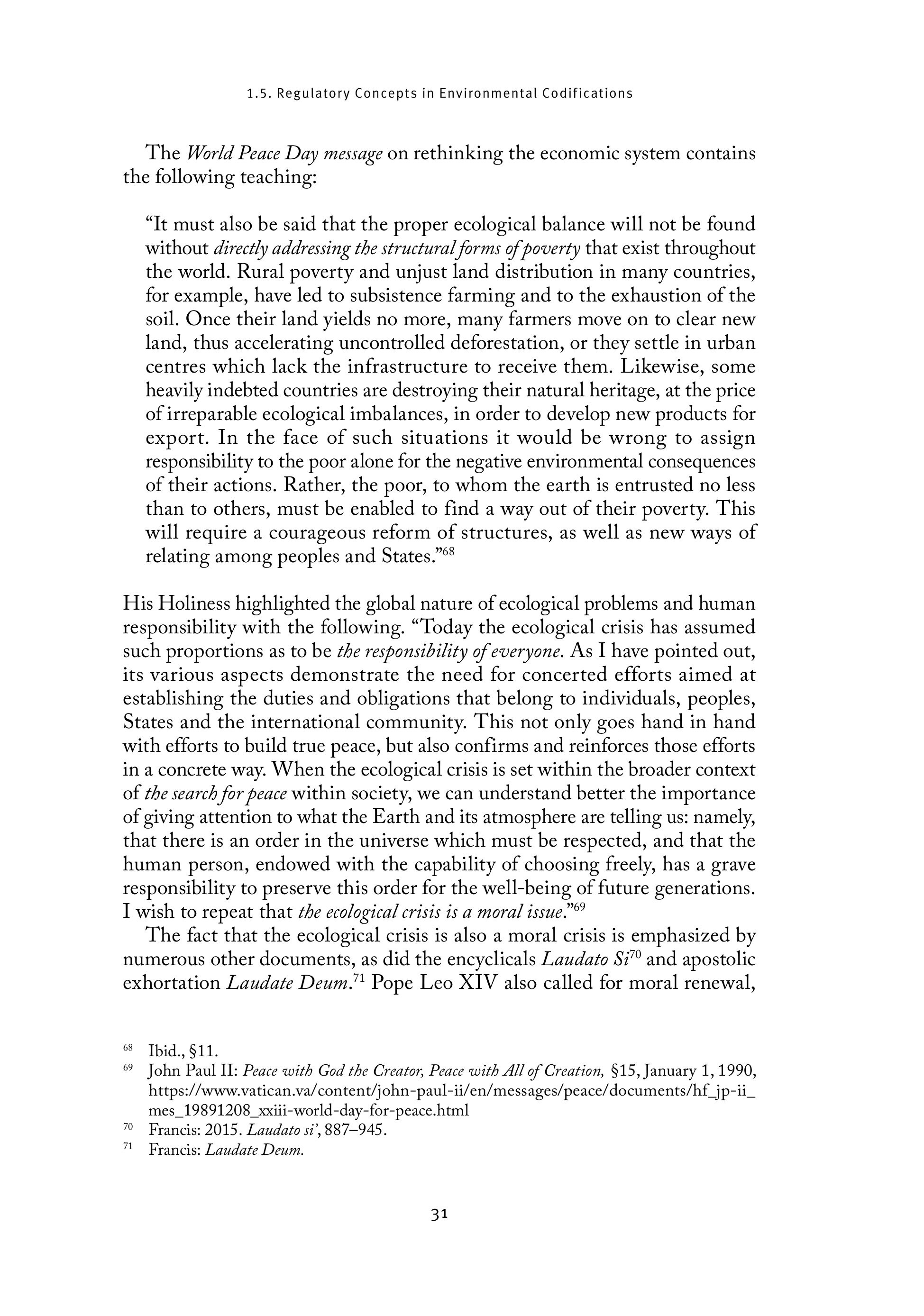 1.5. Regulatory Concepts in Environmental Codifications The World Peace Day message on rethinking the economic system contains the following teaching: "It must also be said that the proper ecological balance will not be found without directly addressing the structural forms of poverty that exist throughout the world. Rural poverty and unjust land distribution in many countries, for example, have led to subsistence farming and to the exhaustion of the soil. Once their land yields no more, many farmers move on to clear new land, thus accelerating uncontrolled deforestation, or they settle in urban centres which lack the infrastructure to receive them. Likewise, some heavily indebted countries are destroying their natural heritage, at the price of irreparable ecological imbalances, in order to develop new products for export. In the face of such situations it would be wrong to assign responsibility to the poor alone for the negative environmental consequences of their actions. Rather, the poor, to whom the earth is entrusted no less than to others, must be enabled to find a way out of their poverty. This will require a courageous reform of structures, as well as new ways of relating among peoples and States." His Holiness highlighted the global nature of ecological problems and human responsibility with the following. “Today the ecological crisis has assumed such proportions as to be the responsibility of everyone. As I have pointed out, its various aspects demonstrate the need for concerted efforts aimed at establishing the duties and obligations that belong to individuals, peoples, States and the international community. This not only goes hand in hand with efforts to build true peace, but also confirms and reinforces those efforts in a concrete way. When the ecological crisis is set within the broader context of the search for peace within society, we can understand better the importance of giving attention to what the Earth and its atmosphere are telling us: namely, that there is an order in the universe which must be respected, and that the human person, endowed with the capability of choosing freely, has a grave responsibility to preserve this order for the well-being of future generations. I wish to repeat that che ecological crisis is a moral issue.” The fact that the ecological crisis is also a moral crisis is emphasized by numerous other documents, as did the encyclicals Laudato Si” and apostolic exhortation Laudate Deum.” Pope Leo XIV also called for moral renewal, 6 Tbid., §11. ®% John Paul II: Peace with God the Creator, Peace with All of Creation, §15, January 1, 1990, https://www.vatican.va/content/john-paul-ii/en/messages/peace/documents/hf_jp-ii_ mes_19891208_xxiii-world-day-for-peace.html 7” Francis: 2015. Laudato si’, 887-945. 7! Francis: Laudate Deum. 31