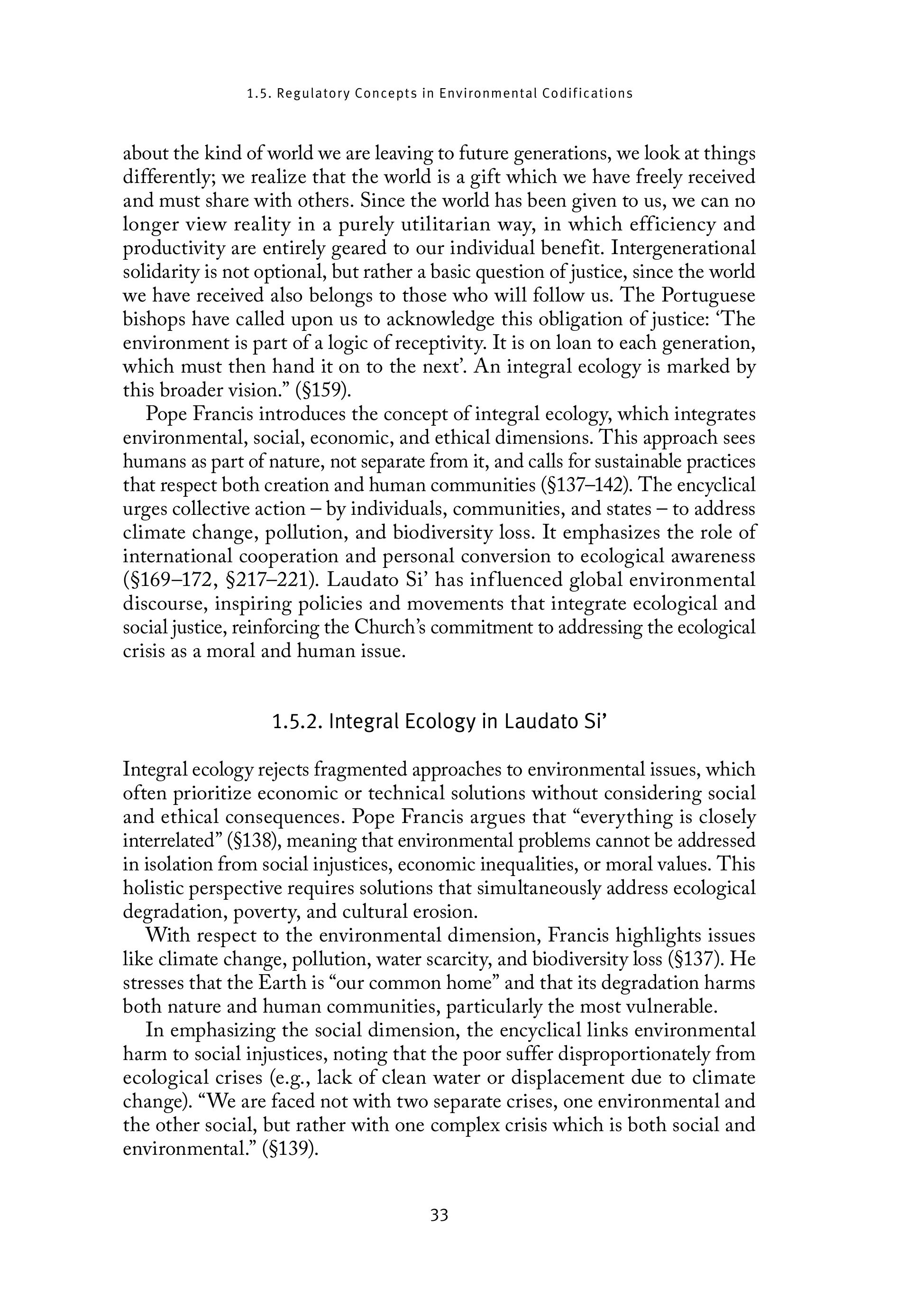 1.5. Regulatory Concepts in Environmental Codifications about the kind of world we are leaving to future generations, we look at things differently; we realize that the world is a gift which we have freely received and must share with others. Since the world has been given to us, we can no longer view reality in a purely utilitarian way, in which efficiency and productivity are entirely geared to our individual benefit. Intergenerational solidarity is not optional, but rather a basic guestion of justice, since the world we have received also belongs to those who will follow us. The Portuguese bishops have called upon us to acknowledge this obligation of justice: “he environment is part of a logic of receptivity. It is on loan to each generation, which must then hand it on to the next’. An integral ecology is marked by this broader vision.” (§159). Pope Francis introduces the concept of integral ecology, which integrates environmental, social, economic, and ethical dimensions. This approach sees humans as part of nature, not separate from it, and calls for sustainable practices that respect both creation and human communities (§137—-142). The encyclical urges collective action — by individuals, communities, and states — to address climate change, pollution, and biodiversity loss. It emphasizes the role of international cooperation and personal conversion to ecological awareness (§169-172, §217-221). Laudato Si’ has influenced global environmental discourse, inspiring policies and movements that integrate ecological and social justice, reinforcing the Church’s commitment to addressing the ecological crisis as a moral and human issue. 1.5.2. Integral Ecology in Laudato Si’ Integral ecology rejects fragmented approaches to environmental issues, which often prioritize economic or technical solutions without considering social and ethical consequences. Pope Francis argues that “everything is closely interrelated” (§138), meaning that environmental problems cannot be addressed in isolation from social injustices, economic inequalities, or moral values. This holistic perspective requires solutions that simultaneously address ecological degradation, poverty, and cultural erosion. With respect to the environmental dimension, Francis highlights issues like climate change, pollution, water scarcity, and biodiversity loss (§137). He stresses that the Earth is “our common home” and that its degradation harms both nature and human communities, particularly the most vulnerable. In emphasizing the social dimension, the encyclical links environmental harm to social injustices, noting that the poor suffer disproportionately from ecological crises (e.g., lack of clean water or displacement due to climate change). “We are faced not with two separate crises, one environmental and the other social, but rather with one complex crisis which is both social and environmental.” (§139). 33