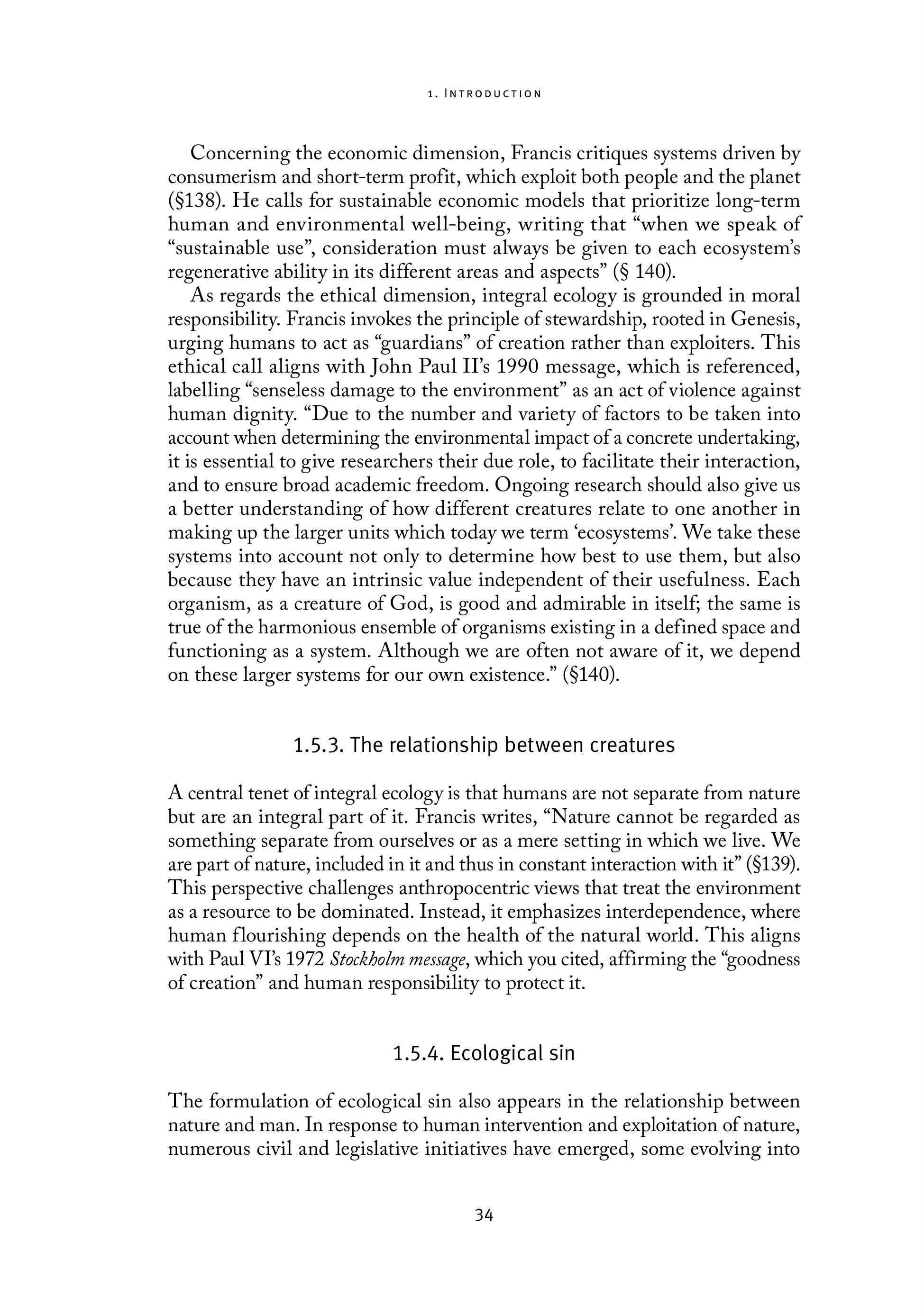 1. INTRODUCTION Concerning the economic dimension, Francis critigues systems driven by consumerism and short-term profit, which exploit both people and the planet (§138). He calls for sustainable economic models that prioritize long-term human and environmental well-being, writing that "when we speak of “sustainable use”, consideration must always be given to each ecosystem’s regenerative ability in its different areas and aspects” (§ 140). As regards the ethical dimension, integral ecology is grounded in moral responsibility. Francis invokes the principle of stewardship, rooted in Genesis, urging humans to act as “guardians” of creation rather than exploiters. This ethical call aligns with John Paul II’s 1990 message, which is referenced, labelling “senseless damage to the environment” as an act of violence against human dignity. “Due to the number and variety of factors to be taken into account when determining the environmental impact of a concrete undertaking, it is essential to give researchers their due role, to facilitate their interaction, and to ensure broad academic freedom. Ongoing research should also give us a better understanding of how different creatures relate to one another in making up the larger units which today we term ‘ecosystems’. We take these systems into account not only to determine how best to use them, but also because they have an intrinsic value independent of their usefulness. Each organism, as a creature of God, is good and admirable in itself; the same is true of the harmonious ensemble of organisms existing in a defined space and functioning as a system. Although we are often not aware of it, we depend on these larger systems for our own existence.” (§140). 1.5.3. The relationship between creatures A central tenet of integral ecology is that humans are not separate from nature but are an integral part of it. Francis writes, “Nature cannot be regarded as something separate from ourselves or as a mere setting in which we live. We are part of nature, included in it and thus in constant interaction with it” (§139). This perspective challenges anthropocentric views that treat the environment as a resource to be dominated. Instead, it emphasizes interdependence, where human flourishing depends on the health of the natural world. ‘This aligns with Paul VTs 1972 Stockholm message, which you cited, affirming the “goodness of creation” and human responsibility to protect it. 1.5.4. Ecological sin The formulation of ecological sin also appears in the relationship between nature and man. In response to human intervention and exploitation of nature, numerous civil and legislative initiatives have emerged, some evolving into 34