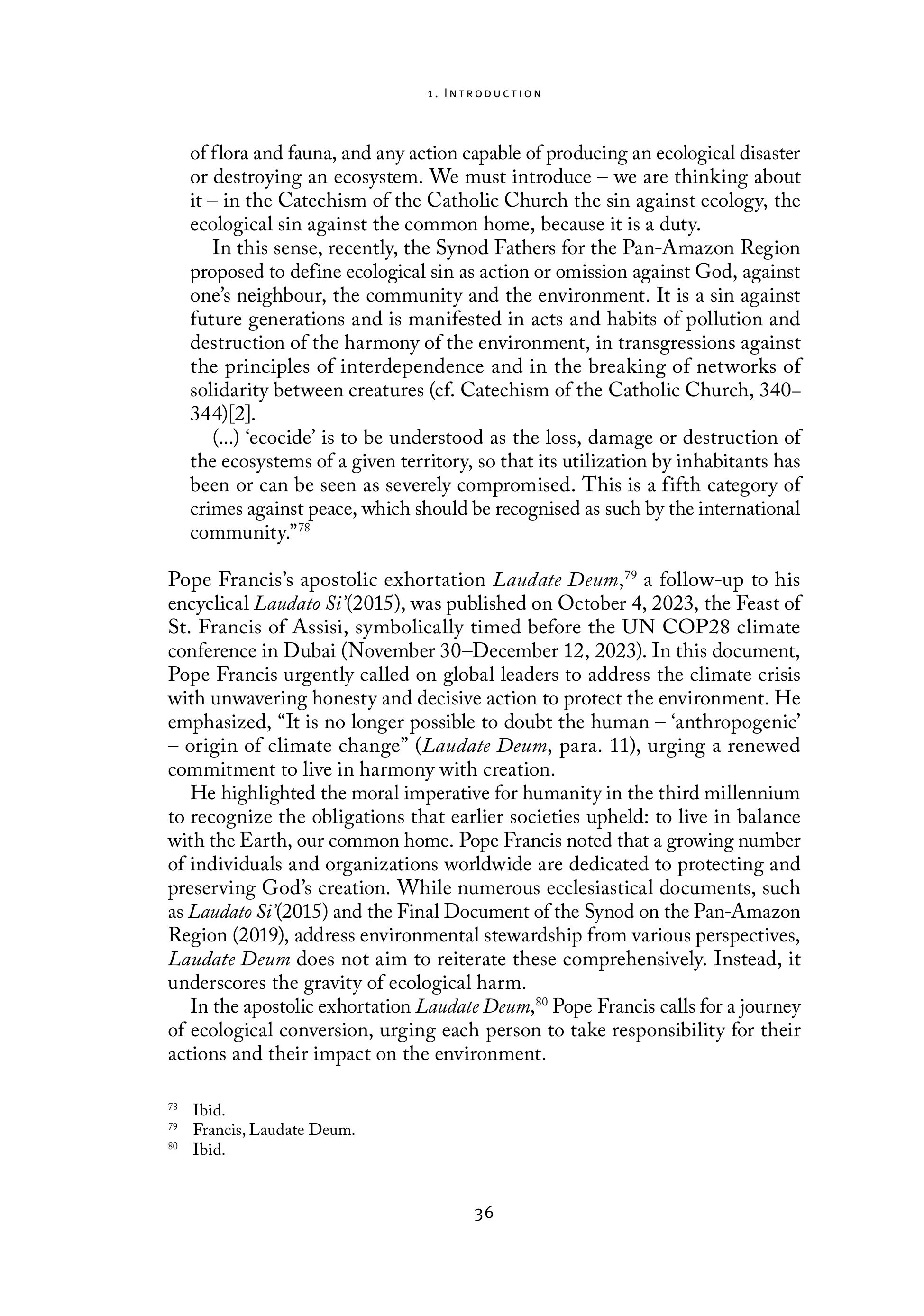 1. INTRODUCTION of flora and fauna, and any action capable of producing an ecological disaster or destroying an ecosystem. We must introduce — we are thinking about it — in the Catechism of the Catholic Church the sin against ecology, the ecological sin against the common home, because it is a duty. In this sense, recently, the Synod Fathers for the Pan-Amazon Region proposed to define ecological sin as action or omission against God, against one’s neighbour, the community and the environment. It is a sin against future generations and is manifested in acts and habits of pollution and destruction of the harmony of the environment, in transgressions against the principles of interdependence and in the breaking of networks of solidarity between creatures (cf. Catechism of the Catholic Church, 340344)[2]. (...) ‘ecocide’ is to be understood as the loss, damage or destruction of the ecosystems of a given territory, so that its utilization by inhabitants has been or can be seen as severely compromised. This is a fifth category of crimes against peace, which should be recognised as such by the international community.” Pope Francis’s apostolic exhortation Laudate Deum,” a follow-up to his encyclical Laudato Si(2015), was published on October 4, 2023, the Feast of St. Francis of Assisi, symbolically timed before the UN COP28 climate conference in Dubai (November 30-December 12, 2023). In this document, Pope Francis urgently called on global leaders to address the climate crisis with unwavering honesty and decisive action to protect the environment. He emphasized, “It is no longer possible to doubt the human — ‘anthropogenic’ — origin of climate change” (Laudate Deum, para. 11), urging a renewed commitment to live in harmony with creation. He highlighted the moral imperative for humanity in the third millennium to recognize the obligations that earlier societies upheld: to live in balance with the Earth, our common home. Pope Francis noted that a growing number of individuals and organizations worldwide are dedicated to protecting and preserving God’s creation. While numerous ecclesiastical documents, such as Laudato Si (2015) and the Final Document of the Synod on the Pan-Amazon Region (2019), address environmental stewardship from various perspectives, Laudate Deum does not aim to reiterate these comprehensively. Instead, it underscores the gravity of ecological harm. In the apostolic exhortation Laudate Deum,* Pope Francis calls for a journey of ecological conversion, urging each person to take responsibility for their actions and their impact on the environment. 78 Ibid. 7 Francis, Laudate Deum. 8 Thid. 36