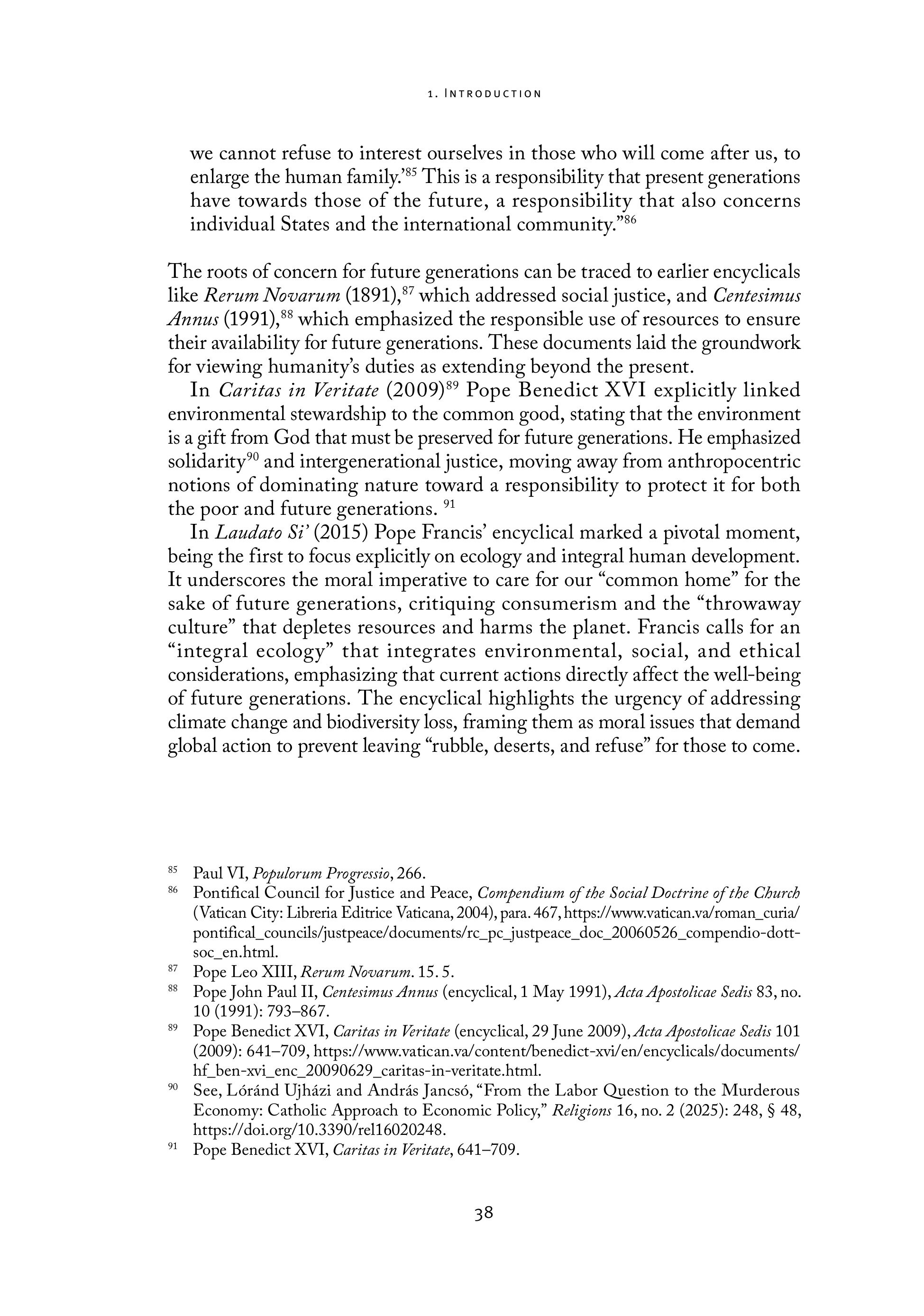 1. INTRODUCTION we cannot refuse to interest ourselves in those who will come after us, to enlarge the human family. This is a responsibility that present generations have towards those of the future, a responsibility that also concerns individual States and the international community.” The roots of concern for future generations can be traced to earlier encyclicals like Rerum Novarum (1891),*’ which addressed social justice, and Centesimus Annus (1991),*8 which emphasized the responsible use of resources to ensure their availability for future generations. These documents laid the groundwork for viewing humanity’s duties as extending beyond the present. In Caritas in Veritate (2009) Pope Benedict XVI explicitly linked environmental stewardship to the common good, stating that the environment is a gift from God that must be preserved for future generations. He emphasized solidarity” and intergenerational justice, moving away from anthropocentric notions of dominating nature toward a responsibility to protect it for both the poor and future generations. ”" In Laudato Si’ (2015) Pope Francis’ encyclical marked a pivotal moment, being the first to focus explicitly on ecology and integral human development. It underscores the moral imperative to care for our “common home” for the sake of future generations, critiquing consumerism and the “throwaway culture” that depletes resources and harms the planet. Francis calls for an “integral ecology” that integrates environmental, social, and ethical considerations, emphasizing that current actions directly affect the well-being of future generations. The encyclical highlights the urgency of addressing climate change and biodiversity loss, framing them as moral issues that demand global action to prevent leaving “rubble, deserts, and refuse” for those to come. ® Paul VI, Populorum Progressio, 266. 8° Pontifical Council for Justice and Peace, Compendium of the Social Doctrine of the Church (Vatican City: Libreria Editrice Vaticana, 2004), para. 467, https://www.vatican.va/roman_curia/ pontifical_councils/justpeace/documents/rc_pc_justpeace_doc_20060526_compendio-dottsoc_en.html. 87 Pope Leo XIII, Rerum Novarum. 15.5. 88 Pope John Paul II, Centesimus Annus (encyclical, 1 May 1991), Acta Apostolicae Sedis 83, no. 10 (1991): 793-867. Pope Benedict XVI, Caritas in Veritate (encyclical, 29 June 2009), Acta Apostolicae Sedis 101 (2009): 641-709, https://www.vatican.va/content/benedict-xvi/en/encyclicals/documents/ hf_ben-xvi_enc_20090629_caritas-in-veritate.html. 9 See, Lóránd Ujhäzi and Andräs Jancsö, “From the Labor Question to the Murderous Economy: Catholic Approach to Economic Policy,” Religions 16, no. 2 (2025): 248, § 48, https://doi.org/10.3390/rel1 6020248. 1 Pope Benedict XVI, Caritas in Veritate, 641-709. 38