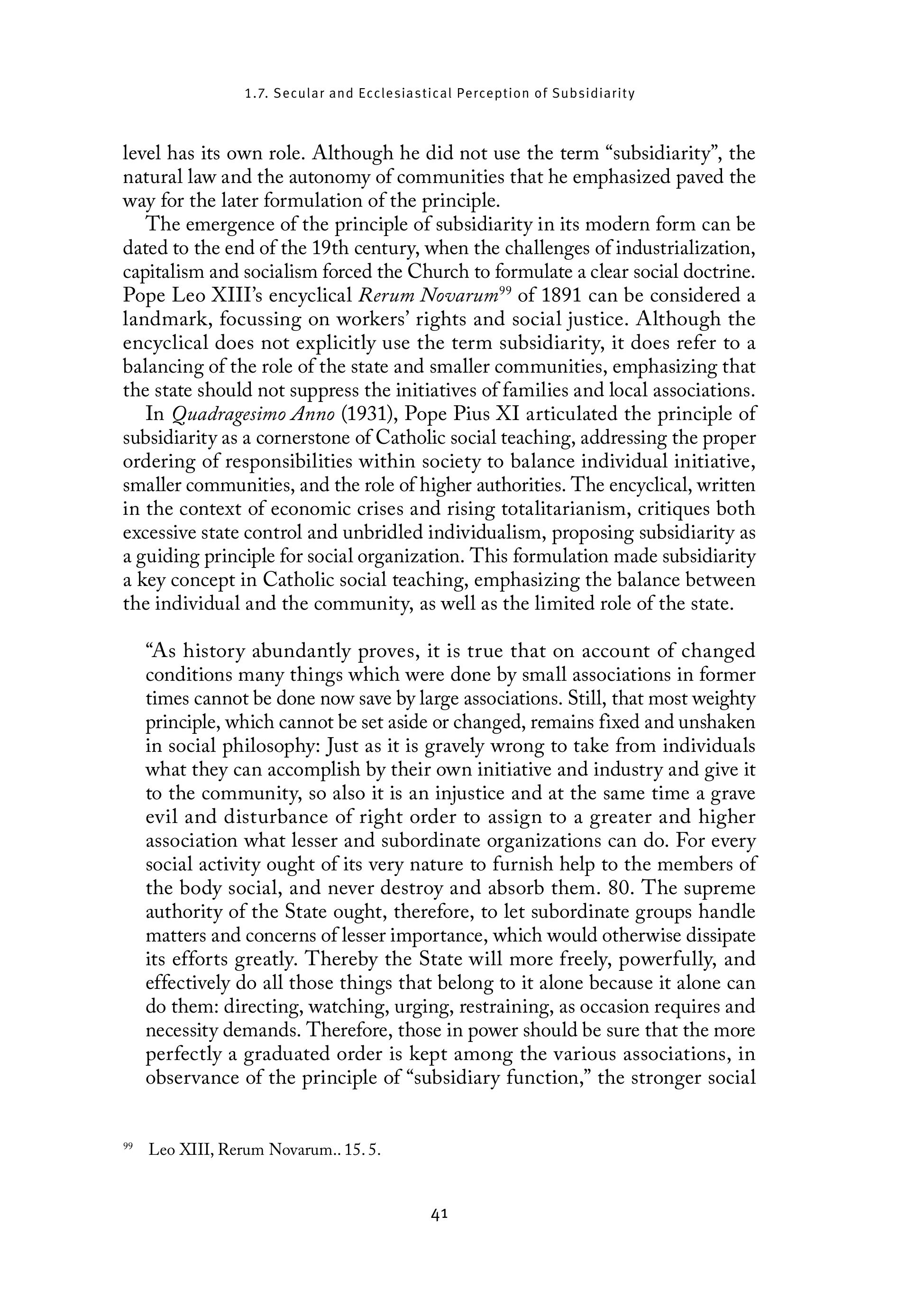 1.7. Secular and Ecclesiastical Perception of Subsidiarity level has its own role. Although he did not use the term “subsidiarity”, the natural law and the autonomy of communities that he emphasized paved the way for the later formulation of the principle. The emergence of the principle of subsidiarity in its modern form can be dated to the end of the 19th century, when the challenges of industrialization, capitalism and socialism forced the Church to formulate a clear social doctrine. Pope Leo XIII’s encyclical Rerum Novarum” of 1891 can be considered a landmark, focussing on workers’ rights and social justice. Although the encyclical does not explicitly use the term subsidiarity, it does refer to a balancing of the role of the state and smaller communities, emphasizing that the state should not suppress the initiatives of families and local associations. In Quadragesimo Anno (1931), Pope Pius XI articulated the principle of subsidiarity as a cornerstone of Catholic social teaching, addressing the proper ordering of responsibilities within society to balance individual initiative, smaller communities, and the role of higher authorities. The encyclical, written in the context of economic crises and rising totalitarianism, critiques both excessive state control and unbridled individualism, proposing subsidiarity as a guiding principle for social organization. This formulation made subsidiarity a key concept in Catholic social teaching, emphasizing the balance between the individual and the community, as well as the limited role of the state. “As history abundantly proves, it is true that on account of changed conditions many things which were done by small associations in former times cannot be done now save by large associations. Still, that most weighty principle, which cannot be set aside or changed, remains fixed and unshaken in social philosophy: Just as it is gravely wrong to take from individuals what they can accomplish by their own initiative and industry and give it to the community, so also it is an injustice and at the same time a grave evil and disturbance of right order to assign to a greater and higher association what lesser and subordinate organizations can do. For every social activity ought of its very nature to furnish help to the members of the body social, and never destroy and absorb them. 80. The supreme authority of the State ought, therefore, to let subordinate groups handle matters and concerns of lesser importance, which would otherwise dissipate its efforts greatly. Thereby the State will more freely, powerfully, and effectively do all those things that belong to it alone because it alone can do them: directing, watching, urging, restraining, as occasion requires and necessity demands. Therefore, those in power should be sure that the more perfectly a graduated order is kept among the various associations, in observance of the principle of “subsidiary function,” the stronger social 9 Leo XIII, Rerum Novarum.. 15.5. 41