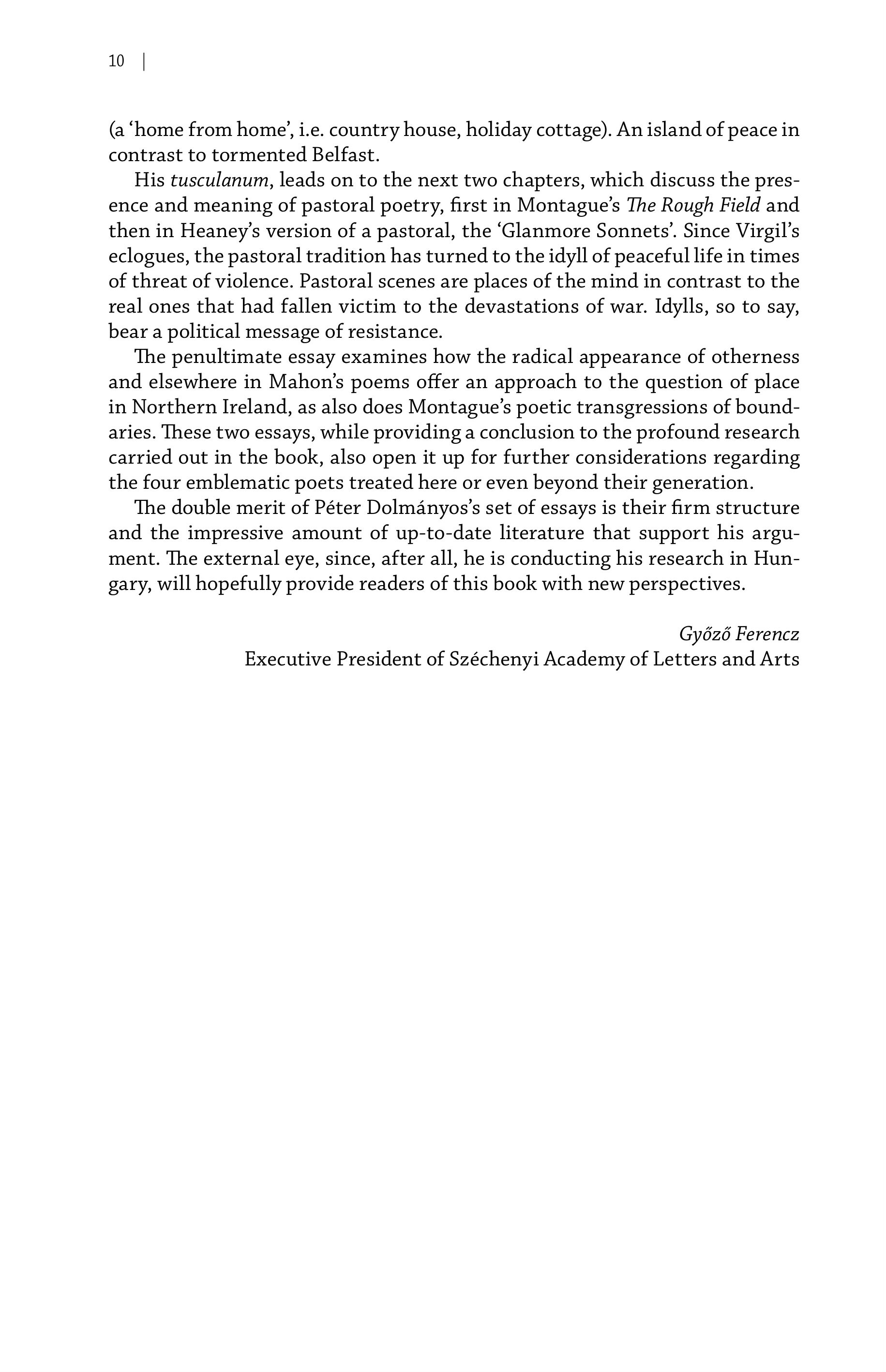 10 | (a ‘home from home’, i.e. country house, holiday cottage). An island of peace in contrast to tormented Belfast. His tusculanum, leads on to the next two chapters, which discuss the presence and meaning of pastoral poetry, first in Montague’s The Rough Field and then in Heaney’s version of a pastoral, the ‘Glanmore Sonnets’. Since Virgil’s eclogues, the pastoral tradition has turned to the idyll of peaceful life in times of threat of violence. Pastoral scenes are places of the mind in contrast to the real ones that had fallen victim to the devastations of war. Idylls, so to say, bear a political message of resistance. The penultimate essay examines how the radical appearance of otherness and elsewhere in Mahon’s poems offer an approach to the question of place in Northern Ireland, as also does Montague’s poetic transgressions of boundaries. These two essays, while providing a conclusion to the profound research carried out in the book, also open it up for further considerations regarding the four emblematic poets treated here or even beyond their generation. The double merit of Péter Dolmanyos’s set of essays is their firm structure and the impressive amount of up-to-date literature that support his argument. The external eye, since, after all, he is conducting his research in Hungary, will hopefully provide readers of this book with new perspectives. Győző Ferencz Executive President of Széchenyi Academy of Letters and Arts