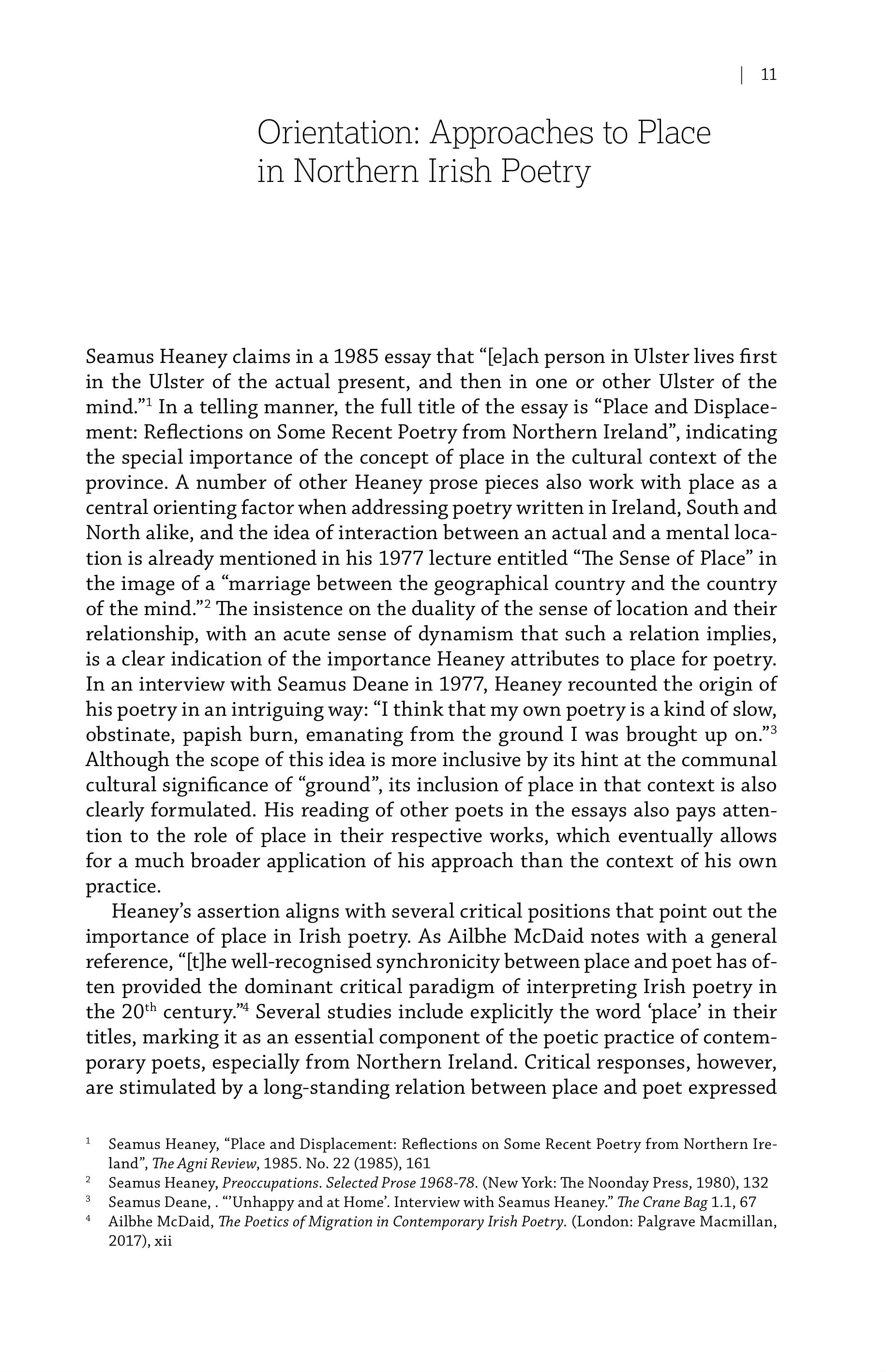 | 11 Orientation: Approaches to Place in Northern Irish Poetry Seamus Heaney claims in a 1985 essay that “[elach person in Ulster lives first in the Ulster of the actual present, and then in one or other Ulster of the mind.”! In a telling manner, the full title of the essay is “Place and Displacement: Reflections on Some Recent Poetry from Northern Ireland”, indicating the special importance of the concept of place in the cultural context of the province. A number of other Heaney prose pieces also work with place as a central orienting factor when addressing poetry written in Ireland, South and North alike, and the idea of interaction between an actual and a mental location is already mentioned in his 1977 lecture entitled “The Sense of Place” in the image of a “marriage between the geographical country and the country of the mind.”* The insistence on the duality of the sense of location and their relationship, with an acute sense of dynamism that such a relation implies, is a clear indication of the importance Heaney attributes to place for poetry. In an interview with Seamus Deane in 1977, Heaney recounted the origin of his poetry in an intriguing way: “I think that my own poetry is a kind of slow, obstinate, papish burn, emanating from the ground I was brought up on.”? Although the scope of this idea is more inclusive by its hint at the communal cultural significance of “ground”, its inclusion of place in that context is also clearly formulated. His reading of other poets in the essays also pays attention to the role of place in their respective works, which eventually allows for a much broader application of his approach than the context of his own practice. Heaney’s assertion aligns with several critical positions that point out the importance of place in Irish poetry. As Ailbhe McDaid notes with a general reference, “[t]he well-recognised synchronicity between place and poet has often provided the dominant critical paradigm of interpreting Irish poetry in the 20" century.” Several studies include explicitly the word ‘place’ in their titles, marking it as an essential component of the poetic practice of contemporary poets, especially from Northern Ireland. Critical responses, however, are stimulated by a long-standing relation between place and poet expressed Seamus Heaney, “Place and Displacement: Reflections on Some Recent Poetry from Northern Ireland”, The Agni Review, 1985. No. 22 (1985), 161 2 Seamus Heaney, Preoccupations. Selected Prose 1968-78. (New York: The Noonday Press, 1980), 132 Seamus Deane, . “Unhappy and at Home’. Interview with Seamus Heaney.” The Crane Bag 1.1, 67 Ailbhe McDaid, The Poetics of Migration in Contemporary Irish Poetry. (London: Palgrave Macmillan, 2017), xii