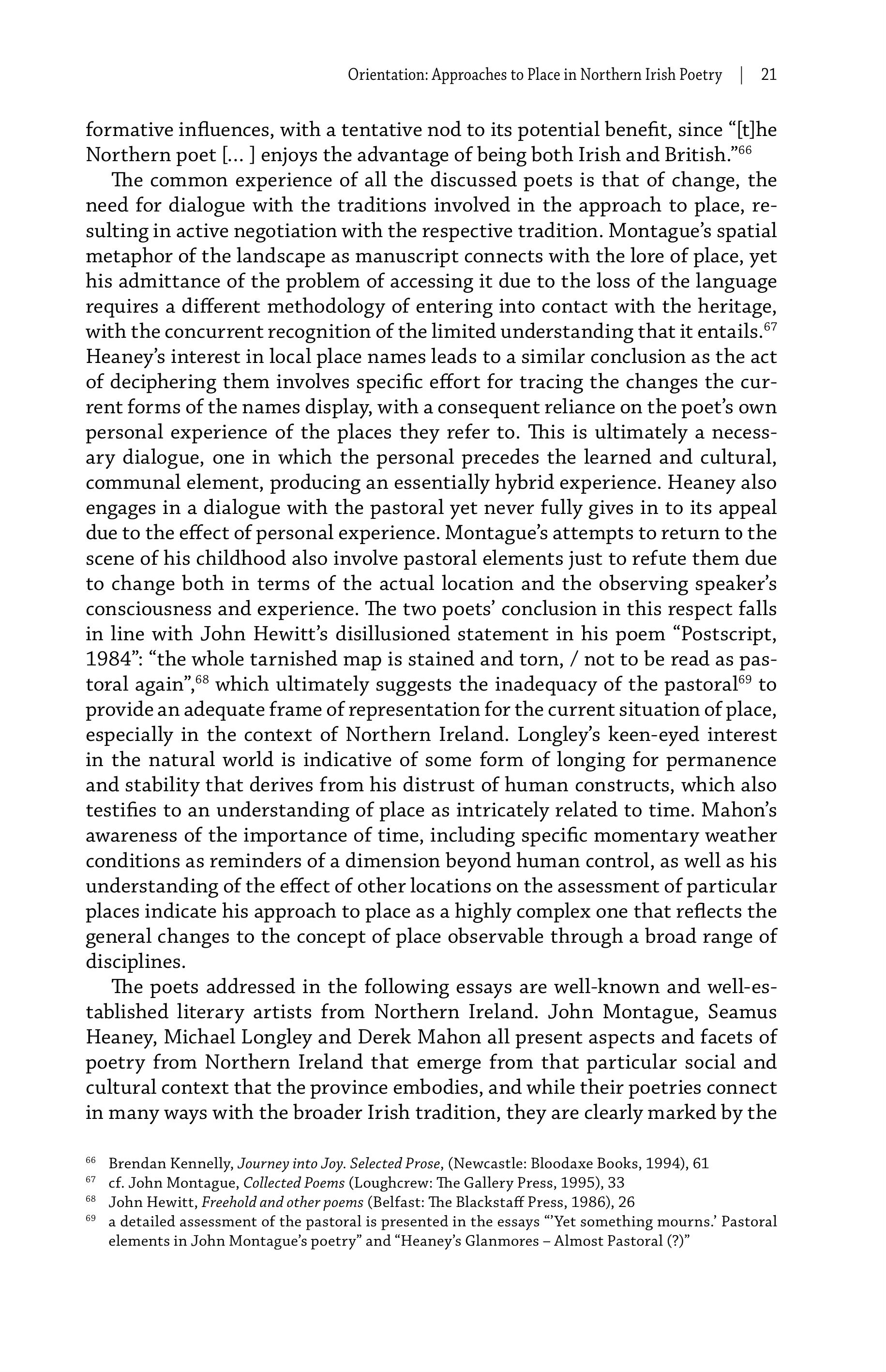 Orientation: Approaches to Place in Northern Irish Poetry ] 21 formative influences, with a tentative nod to its potential benefit, since “[t]he Northern poet [... ] enjoys the advantage of being both Irish and British.” The common experience of all the discussed poets is that of change, the need for dialogue with the traditions involved in the approach to place, resulting in active negotiation with the respective tradition. Montague’s spatial metaphor of the landscape as manuscript connects with the lore of place, yet his admittance of the problem of accessing it due to the loss of the language requires a different methodology of entering into contact with the heritage, with the concurrent recognition of the limited understanding that it entails.°” Heaney’s interest in local place names leads to a similar conclusion as the act of deciphering them involves specific effort for tracing the changes the current forms of the names display, with a consequent reliance on the poet’s own personal experience of the places they refer to. This is ultimately a necessary dialogue, one in which the personal precedes the learned and cultural, communal element, producing an essentially hybrid experience. Heaney also engages in a dialogue with the pastoral yet never fully gives in to its appeal due to the effect of personal experience. Montague’s attempts to return to the scene of his childhood also involve pastoral elements just to refute them due to change both in terms of the actual location and the observing speaker’s consciousness and experience. The two poets’ conclusion in this respect falls in line with John Hewitt’s disillusioned statement in his poem “Postscript, 1984”: “the whole tarnished map is stained and torn, / not to be read as pastoral again”, which ultimately suggests the inadequacy of the pastoral" to provide an adequate frame of representation for the current situation of place, especially in the context of Northern Ireland. Longley’s keen-eyed interest in the natural world is indicative of some form of longing for permanence and stability that derives from his distrust of human constructs, which also testifies to an understanding of place as intricately related to time. Mahon’s awareness of the importance of time, including specific momentary weather conditions as reminders of a dimension beyond human control, as well as his understanding of the effect of other locations on the assessment of particular places indicate his approach to place as a highly complex one that reflects the general changes to the concept of place observable through a broad range of disciplines. The poets addressed in the following essays are well-known and well-established literary artists from Northern Ireland. John Montague, Seamus Heaney, Michael Longley and Derek Mahon all present aspects and facets of poetry from Northern Ireland that emerge from that particular social and cultural context that the province embodies, and while their poetries connect in many ways with the broader Irish tradition, they are clearly marked by the 66 Brendan Kennelly, Journey into Joy. Selected Prose, (Newcastle: Bloodaxe Books, 1994), 61 8” cf. John Montague, Collected Poems (Loughcrew: The Gallery Press, 1995), 33 68 John Hewitt, Freehold and other poems (Belfast: The Blackstaff Press, 1986), 26 6° a detailed assessment of the pastoral is presented in the essays “Yet something mourns.’ Pastoral elements in John Montague’s poetry” and “Heaney’s Glanmores - Almost Pastoral (?)”