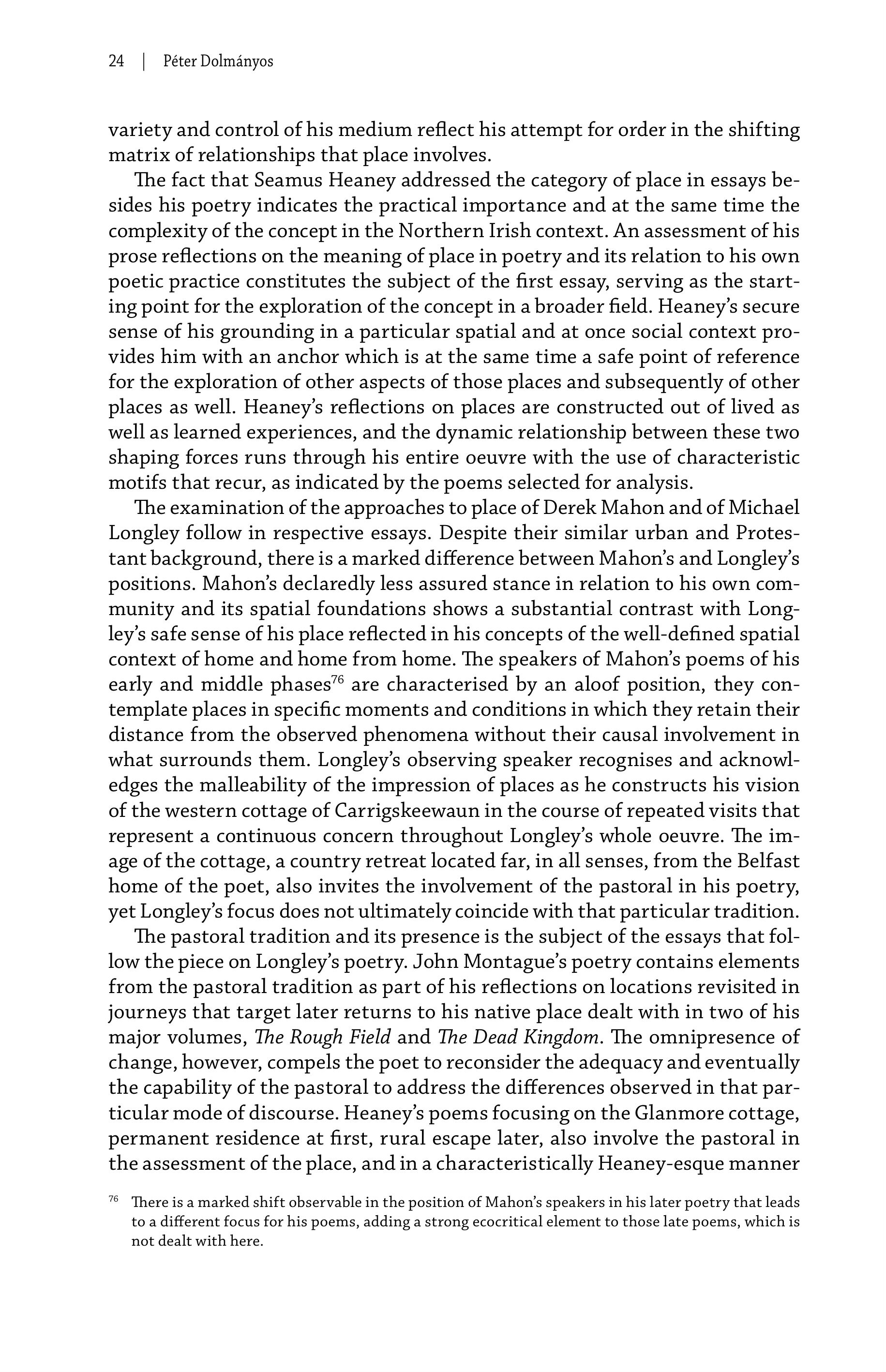 24 | Péter Dolmanyos variety and control of his medium reflect his attempt for order in the shifting matrix of relationships that place involves. The fact that Seamus Heaney addressed the category of place in essays besides his poetry indicates the practical importance and at the same time the complexity of the concept in the Northern Irish context. An assessment of his prose reflections on the meaning of place in poetry and its relation to his own poetic practice constitutes the subject of the first essay, serving as the starting point for the exploration of the concept in a broader field. Heaney’s secure sense of his grounding in a particular spatial and at once social context provides him with an anchor which is at the same time a safe point of reference for the exploration of other aspects of those places and subsequently of other places as well. Heaney’s reflections on places are constructed out of lived as well as learned experiences, and the dynamic relationship between these two shaping forces runs through his entire oeuvre with the use of characteristic motifs that recur, as indicated by the poems selected for analysis. The examination of the approaches to place of Derek Mahon and of Michael Longley follow in respective essays. Despite their similar urban and Protestant background, there is a marked difference between Mahon’s and Longley’s positions. Mahon’s declaredly less assured stance in relation to his own community and its spatial foundations shows a substantial contrast with Longley’s safe sense of his place reflected in his concepts of the well-defined spatial context of home and home from home. The speakers of Mahon’s poems of his early and middle phases” are characterised by an aloof position, they contemplate places in specific moments and conditions in which they retain their distance from the observed phenomena without their causal involvement in what surrounds them. Longley’s observing speaker recognises and acknowledges the malleability of the impression of places as he constructs his vision of the western cottage of Carrigskeewaun in the course of repeated visits that represent a continuous concern throughout Longley’s whole oeuvre. The image of the cottage, a country retreat located far, in all senses, from the Belfast home of the poet, also invites the involvement of the pastoral in his poetry, yet Longley’s focus does not ultimately coincide with that particular tradition. The pastoral tradition and its presence is the subject of the essays that follow the piece on Longley’s poetry. John Montague’s poetry contains elements from the pastoral tradition as part of his reflections on locations revisited in journeys that target later returns to his native place dealt with in two of his major volumes, The Rough Field and The Dead Kingdom. The omnipresence of change, however, compels the poet to reconsider the adequacy and eventually the capability of the pastoral to address the differences observed in that particular mode of discourse. Heaney’s poems focusing on the Glanmore cottage, permanent residence at first, rural escape later, also involve the pastoral in the assessment of the place, and in a characteristically Heaney-esque manner 76 There is a marked shift observable in the position of Mahon’s speakers in his later poetry that leads to a different focus for his poems, adding a strong ecocritical element to those late poems, which is not dealt with here.