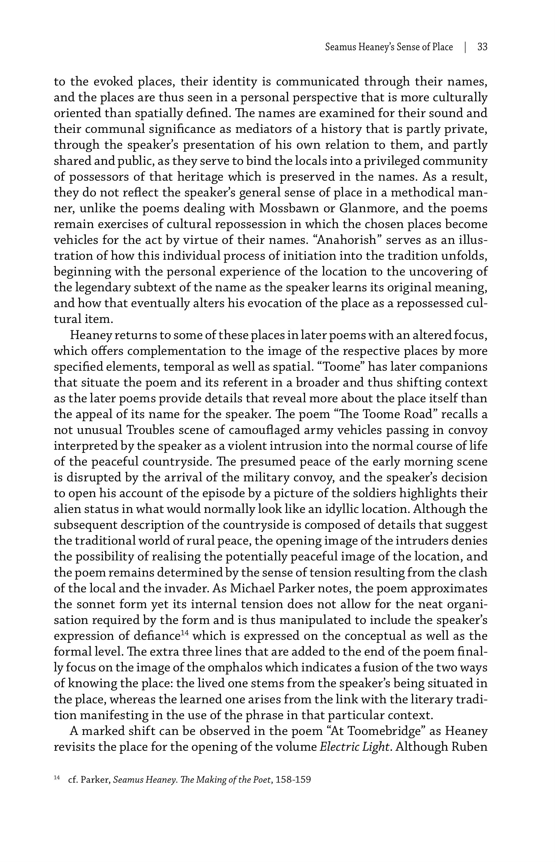 Seamus Heaneys Sense of Place | 33 to the evoked places, their identity is communicated through their names, and the places are thus seen in a personal perspective that is more culturally oriented than spatially defined. The names are examined for their sound and their communal significance as mediators of a history that is partly private, through the speaker’s presentation of his own relation to them, and partly shared and public, as they serve to bind the locals into a privileged community of possessors of that heritage which is preserved in the names. As a result, they do not reflect the speaker’s general sense of place in a methodical manner, unlike the poems dealing with Mossbawn or Glanmore, and the poems remain exercises of cultural repossession in which the chosen places become vehicles for the act by virtue of their names. “Anahorish” serves as an illustration of how this individual process of initiation into the tradition unfolds, beginning with the personal experience of the location to the uncovering of the legendary subtext of the name as the speaker learns its original meaning, and how that eventually alters his evocation of the place as a repossessed cultural item. Heaney returns to some of these places in later poems with an altered focus, which offers complementation to the image of the respective places by more specified elements, temporal as well as spatial. “Toome’” has later companions that situate the poem and its referent in a broader and thus shifting context as the later poems provide details that reveal more about the place itself than the appeal of its name for the speaker. The poem “The Toome Road” recalls a not unusual Troubles scene of camouflaged army vehicles passing in convoy interpreted by the speaker as a violent intrusion into the normal course of life of the peaceful countryside. The presumed peace of the early morning scene is disrupted by the arrival of the military convoy, and the speaker’s decision to open his account of the episode by a picture of the soldiers highlights their alien status in what would normally look like an idyllic location. Although the subsequent description of the countryside is composed of details that suggest the traditional world of rural peace, the opening image of the intruders denies the possibility of realising the potentially peaceful image of the location, and the poem remains determined by the sense of tension resulting from the clash of the local and the invader. As Michael Parker notes, the poem approximates the sonnet form yet its internal tension does not allow for the neat organisation required by the form and is thus manipulated to include the speaker’s expression of defiance'? which is expressed on the conceptual as well as the formal level. The extra three lines that are added to the end of the poem finally focus on the image of the omphalos which indicates a fusion of the two ways of knowing the place: the lived one stems from the speakers being situated in the place, whereas the learned one arises from the link with the literary tradition manifesting in the use of the phrase in that particular context. A marked shift can be observed in the poem “At Toomebridge” as Heaney revisits the place for the opening of the volume Electric Light. Although Ruben 14 cf. Parker, Seamus Heaney. The Making of the Poet, 158-159