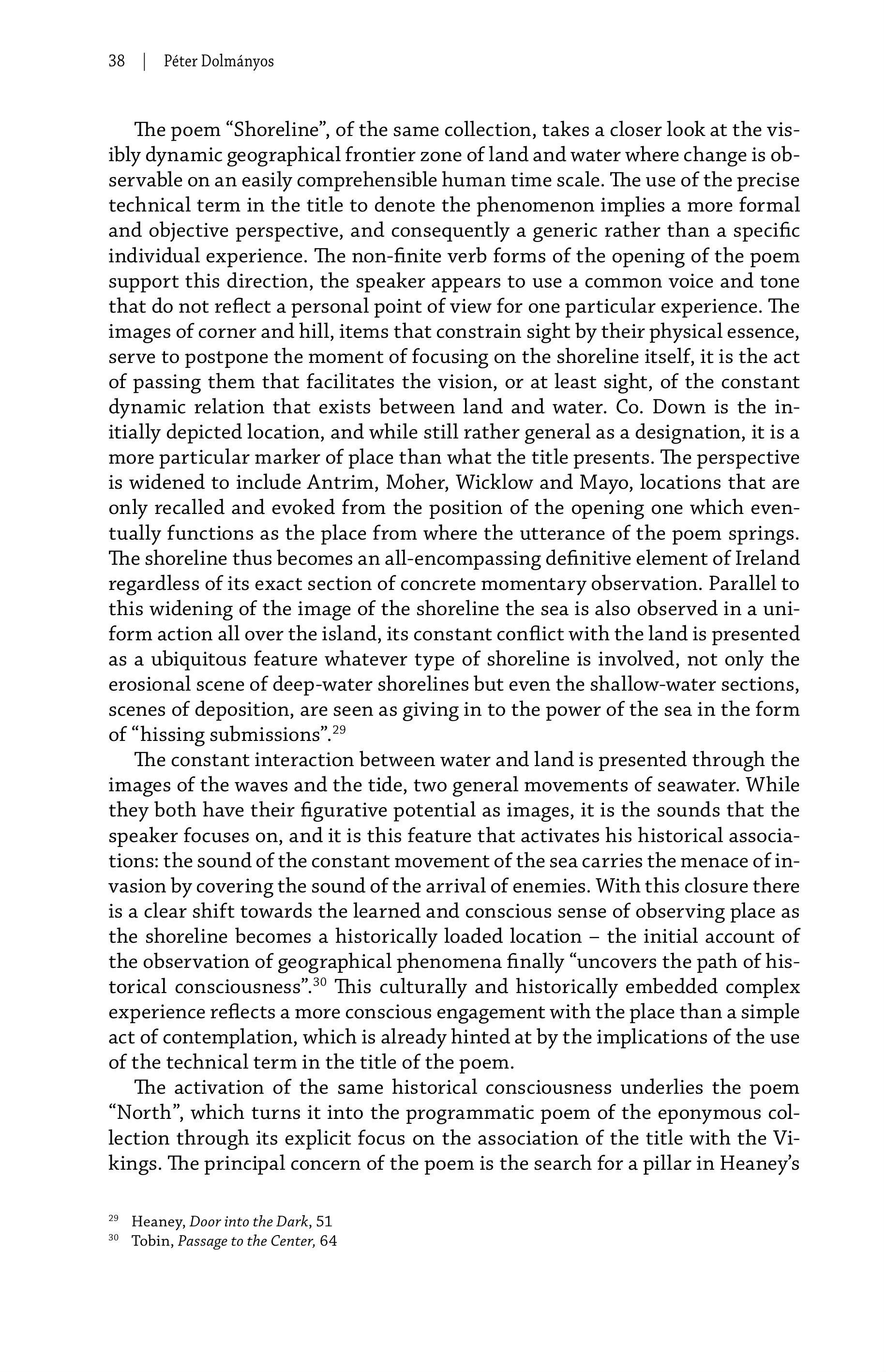 38 | Peter Dolmänyos The poem “Shoreline”, of the same collection, takes a closer look at the visibly dynamic geographical frontier zone of land and water where change is observable on an easily comprehensible human time scale. The use of the precise technical term in the title to denote the phenomenon implies a more formal and objective perspective, and consequently a generic rather than a specific individual experience. The non-finite verb forms of the opening of the poem support this direction, the speaker appears to use a common voice and tone that do not reflect a personal point of view for one particular experience. The images of corner and hill, items that constrain sight by their physical essence, serve to postpone the moment of focusing on the shoreline itself, it is the act of passing them that facilitates the vision, or at least sight, of the constant dynamic relation that exists between land and water. Co. Down is the initially depicted location, and while still rather general as a designation, it is a more particular marker of place than what the title presents. The perspective is widened to include Antrim, Moher, Wicklow and Mayo, locations that are only recalled and evoked from the position of the opening one which eventually functions as the place from where the utterance of the poem springs. The shoreline thus becomes an all-encompassing definitive element of Ireland regardless of its exact section of concrete momentary observation. Parallel to this widening of the image of the shoreline the sea is also observed in a uniform action all over the island, its constant conflict with the land is presented as a ubiquitous feature whatever type of shoreline is involved, not only the erosional scene of deep-water shorelines but even the shallow-water sections, scenes of deposition, are seen as giving in to the power of the sea in the form of “hissing submissions”.”” The constant interaction between water and land is presented through the images of the waves and the tide, two general movements of seawater. While they both have their figurative potential as images, it is the sounds that the speaker focuses on, and it is this feature that activates his historical associations: the sound of the constant movement of the sea carries the menace of invasion by covering the sound of the arrival of enemies. With this closure there is a clear shift towards the learned and conscious sense of observing place as the shoreline becomes a historically loaded location — the initial account of the observation of geographical phenomena finally “uncovers the path of historical consciousness”.*° This culturally and historically embedded complex experience reflects a more conscious engagement with the place than a simple act of contemplation, which is already hinted at by the implications of the use of the technical term in the title of the poem. The activation of the same historical consciousness underlies the poem “North”, which turns it into the programmatic poem of the eponymous collection through its explicit focus on the association of the title with the Vikings. The principal concern of the poem is the search for a pillar in Heaney’s 29 Heaney, Door into the Dark, 51 30 Tobin, Passage to the Center, 64