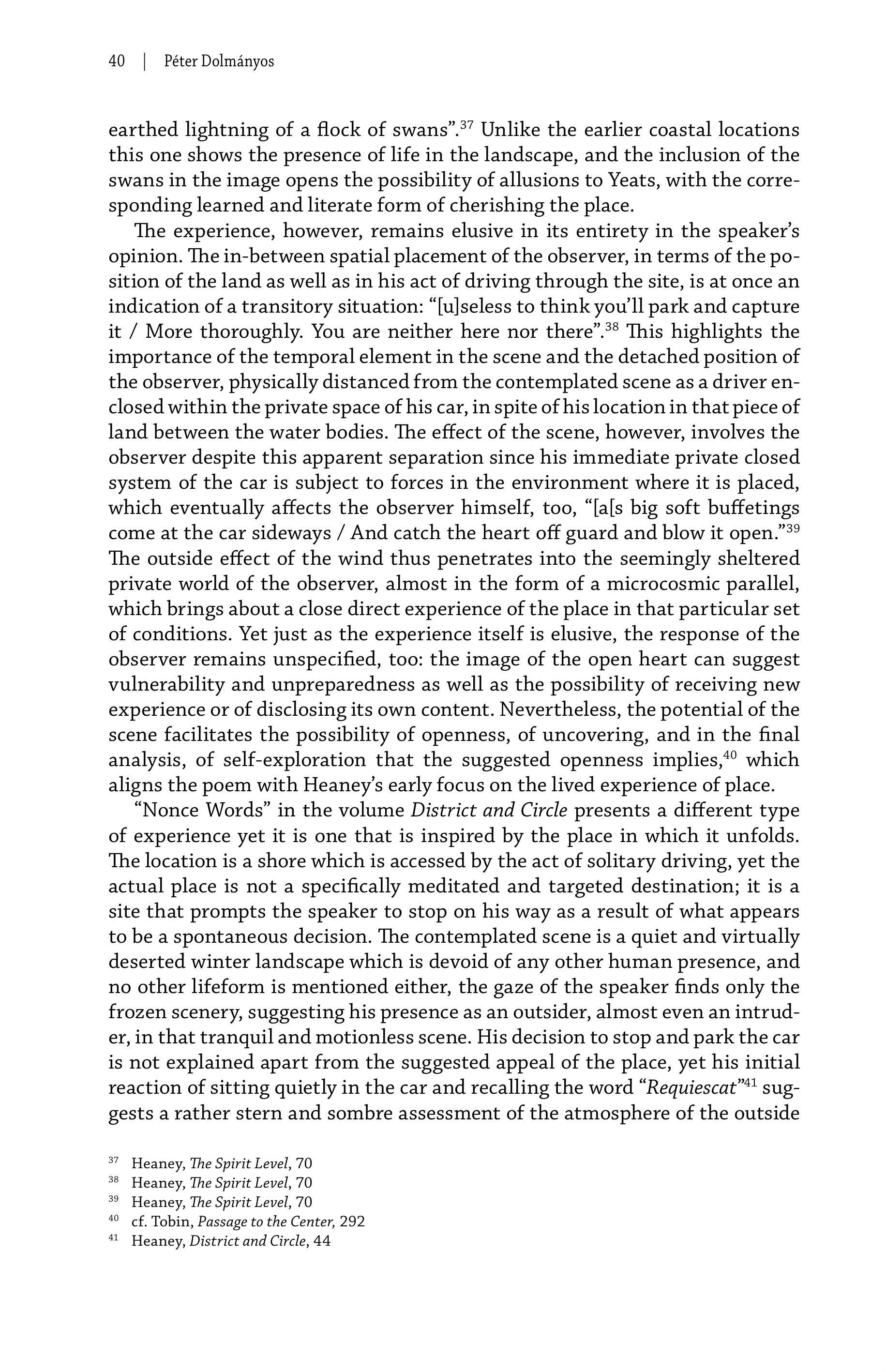 40 | Peter Dolmänyos earthed lightning of a flock of swans”.*’ Unlike the earlier coastal locations this one shows the presence of life in the landscape, and the inclusion of the swans in the image opens the possibility of allusions to Yeats, with the corresponding learned and literate form of cherishing the place. The experience, however, remains elusive in its entirety in the speakers opinion. The in-between spatial placement of the observer, in terms of the position of the land as well as in his act of driving through the site, is at once an indication of a transitory situation: “[u]seless to think you'll park and capture it / More thoroughly. You are neither here nor there”.*® This highlights the importance of the temporal element in the scene and the detached position of the observer, physically distanced from the contemplated scene as a driver enclosed within the private space of his car, in spite of his location in that piece of land between the water bodies. The effect of the scene, however, involves the observer despite this apparent separation since his immediate private closed system of the car is subject to forces in the environment where it is placed, which eventually affects the observer himself, too, "als big soft buffetings come at the car sideways / And catch the heart off guard and blow it open.” The outside effect of the wind thus penetrates into the seemingly sheltered private world of the observer, almost in the form of a microcosmic parallel, which brings about a close direct experience of the place in that particular set of conditions. Yet just as the experience itself is elusive, the response of the observer remains unspecified, too: the image of the open heart can suggest vulnerability and unpreparedness as well as the possibility of receiving new experience or of disclosing its own content. Nevertheless, the potential of the scene facilitates the possibility of openness, of uncovering, and in the final analysis, of self-exploration that the suggested openness implies,*° which aligns the poem with Heaney’s early focus on the lived experience of place. “Nonce Words” in the volume District and Circle presents a different type of experience yet it is one that is inspired by the place in which it unfolds. The location is a shore which is accessed by the act of solitary driving, yet the actual place is not a specifically meditated and targeted destination; it is a site that prompts the speaker to stop on his way as a result of what appears to be a spontaneous decision. The contemplated scene is a quiet and virtually deserted winter landscape which is devoid of any other human presence, and no other lifeform is mentioned either, the gaze of the speaker finds only the frozen scenery, suggesting his presence as an outsider, almost even an intruder, in that tranquil and motionless scene. His decision to stop and park the car is not explained apart from the suggested appeal of the place, yet his initial reaction of sitting quietly in the car and recalling the word “Requiescat™' suggests a rather stern and sombre assessment of the atmosphere of the outside 37 Heaney, The Spirit Level, 70 38 Heaney, The Spirit Level, 70 39 Heaney, The Spirit Level, 70 40 cf. Tobin, Passage to the Center, 292 4 Heaney, District and Circle, 44