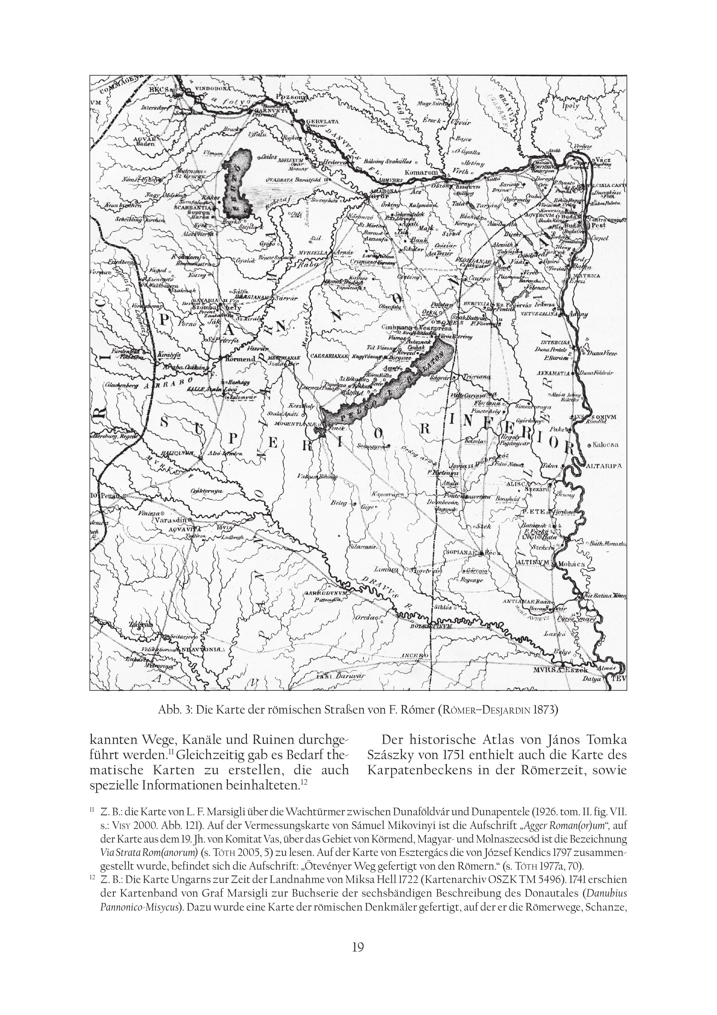 Ez PLAT mere ő 5 = a 7 VINDOBON | s go se BKCS a Ro ate i = a dy A Ipoly Ba EINEN var BÓL N cx Bayer I a A dyatta oHetény Neun ko : 4 ANT A N ” Örkeh true N ang. irises Urry "Räkos Palotn. sy gi \_ Ne sch BR. nes Ÿ Rp e \ Pen 2 cM Os Tarr vana VETVSSALISA RAD N ” zxTHBCISA) Punaontele à A EBaraes el ANNAMATIA N June Földvir a pars a 27, u ma N fé N SEY N I Paksrg| 1 ne 0 R\ e Kalocsa aw sprog ri order PP es Nine Yuta SNS ALTARIEA ae N pS Kes Meely Szalalánáti 3 MOGENTIANA ! Att “ALIS CAY “ig i } a Szexárd; ) Le DoVnéovur * Bonyhád D bs Vesgrab À € x | N Nr N À a x eet N DIESEN 0 i i Siacensis j gsor rasa à aa ALTINYM § \ Lime OAR ctr jaj Gearon ? A = K ne | SA fr, RTE EEE i QARRCDVNVA re N 2 ies BR A ~ | Pittornshie Ses Der ANTIAWAR Baa; ©, 2 jede x % one 1 ase G b =, ne aus | MVRS ES ZE. rer 29 Datyatf E NEE MAD. À 3 Abb. 3: Die Karte der römischen Strafen von F. Römer (RÖMER-DESJARDIN 1873) kannten Wege, Kanäle und Ruinen durchge- Der historische Atlas von Jänos Tomka führt werden." Gleichzeitig gab es Bedarf the- Szäszky von 1751 enthielt auch die Karte des matische Karten zu erstellen, die auch Karpatenbeckens in der Römerzeit, sowie spezielle Informationen beinhalteten.” " Z.B.:die Karte vonL. F. Marsigli über die Wachtürmer zwischen Dunaföldvär und Dunapentele (1926. tom. IL fig. VIL s.: Visy 2000. Abb. 121). Auf der Vermessungskarte von Samuel Mikovinyi ist die Aufschrift ,Agger Roman(or)um“, auf der Karte aus dem 19. Jh. von Komitat Vas, tiber das Gebiet von Körmend, Magyar- und Molnaszecsöd ist die Bezeichnung Via Strata Rom(anorum) (s. TotH 2005, 5) zu lesen. Auf der Karte von Esztergäcs die von Jözsef Kendics 1797 zusammengestellt wurde, befindet sich die Aufschrift: „Ötevenyer Weg gefertigt von den Römern.“ (s. ToTH 1977a, 70). » Z.B.: Die Karte Ungarns zur Zeit der Landnahme von Miksa Hell 1722 (Kartenarchiv OSZK TM 5496). 1741 erschien der Kartenband von Graf Marsigli zur Buchserie der sechsbändigen Beschreibung des Donautales (Danubius Pannonico-Misycus). Dazu wurde eine Karte der römischen Denkmäler gefertigt, auf der er die Römerwege, Schanze, 19