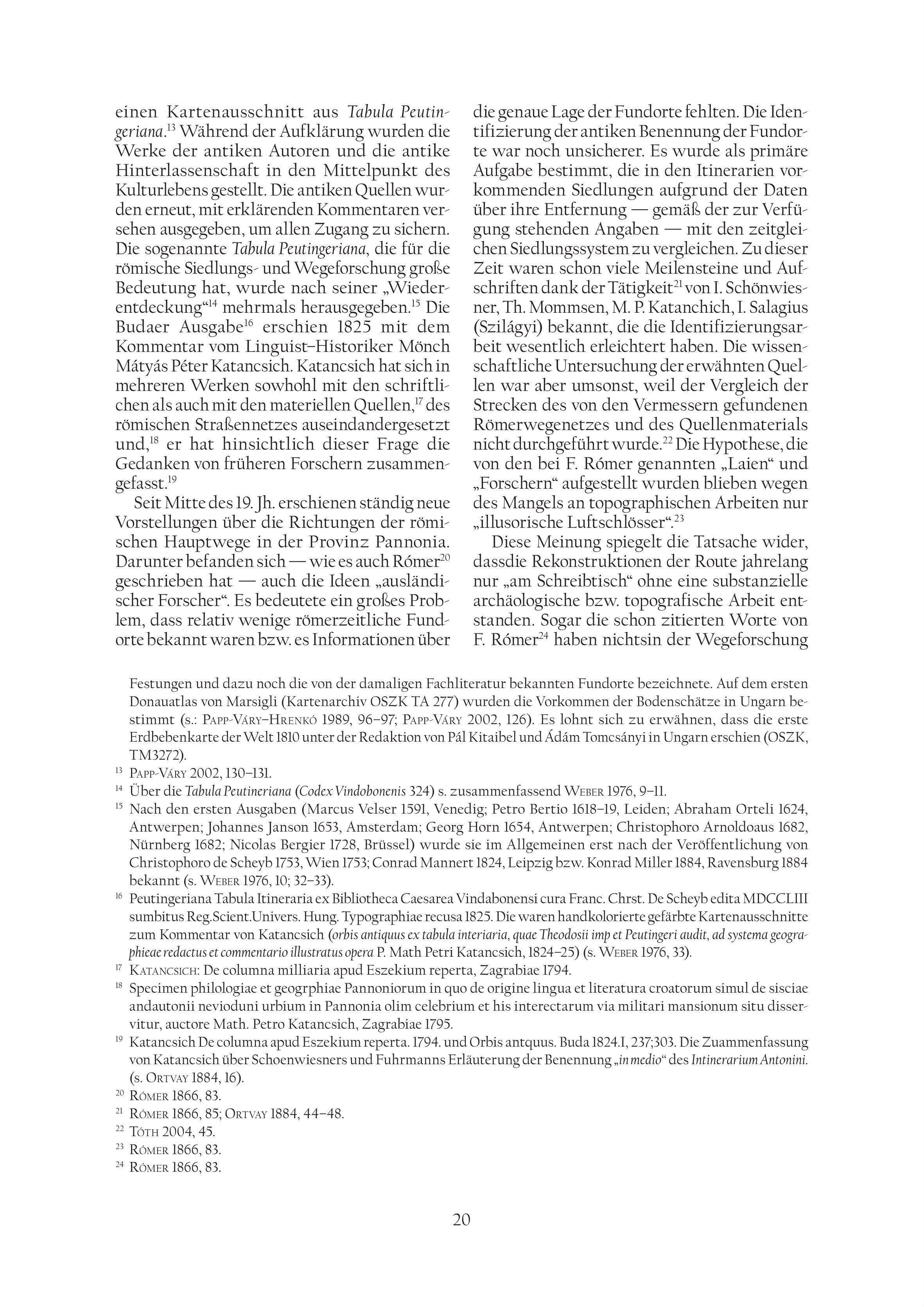 einen Kartenausschnitt aus Tabula Peutingeriana.” Während der Aufklärung wurden die Werke der antiken Autoren und die antike Hinterlassenschaft in den Mittelpunkt des Kulturlebens gestellt. Die antiken Quellen wurden erneut, mit erklärenden Kommentaren versehen ausgegeben, um allen Zugang zu sichern. Die sogenannte Tabula Peutingeriana, die für die römische Siedlungs- und Wegeforschung große Bedeutung hat, wurde nach seiner „Wiederentdeckung“* mehrmals herausgegeben." Die Budaer Ausgabe" erschien 1825 mit dem Kommentar vom Linguist-Historiker Mönch Matyas Péter Katancsich. Katancsich hat sich in mehreren Werken sowhohl mit den schriftlichen als auch mit den materiellen Quellen,” des römischen Straßennetzes auseindandergesetzt und," er hat hinsichtlich dieser Frage die Gedanken von früheren Forschern zusammengefasst." Seit Mitte des 19. Jh. erschienen ständig neue Vorstellungen über die Richtungen der römischen Hauptwege in der Provinz Pannonia. Darunter befanden sich — wie es auch Römer” geschrieben hat — auch die Ideen „ausländischer Forscher“. Es bedeutete ein großes Problem, dass relativ wenige römerzeitliche Fundorte bekannt waren bzw. es Informationen über die genaue Lage der Fundorte fehlten. Die Identifizierung der antiken Benennung der Fundorte war noch unsicherer. Es wurde als primäre Aufgabe bestimmt, die in den Itinerarien vorkommenden Siedlungen aufgrund der Daten über ihre Entfernung — gemäß der zur Verfügung stehenden Angaben — mit den zeitgleichen Siedlungssystem zu vergleichen. Zu dieser Zeit waren schon viele Meilensteine und Auf schriften dank der Tätigkeit” von I. Schönwiesner, Th. Mommsen, M. P. Katanchich, I. Salagius (Szilagyi) bekannt, die die Identifizierungsarbeit wesentlich erleichtert haben. Die wissenschaftliche Untersuchung der erwahnten Quellen war aber umsonst, weil der Vergleich der Strecken des von den Vermessern gefundenen Römerwegenetzes und des Quellenmaterials nicht durchgeführt wurde.” Die Hypothese, die von den bei F. Römer genannten „Laien“ und „Forschern“ aufgestellt wurden blieben wegen des Mangels an topographischen Arbeiten nur „ilusorische Luftschlösser“. Diese Meinung spiegelt die Tatsache wider, dassdie Rekonstruktionen der Route jahrelang nur „am Schreibtisch“ ohne eine substanzielle archäologische bzw. topografische Arbeit ent standen. Sogar die schon zitierten Worte von F. Römer” haben nichtsin der Wegeforschung 17 18 Festungen und dazu noch die von der damaligen Fachliteratur bekannten Fundorte bezeichnete. Auf dem ersten Donauatlas von Marsigli (Kartenarchiv OSZK TA 277) wurden die Vorkommen der Bodenschätze in Ungarn bestimmt (s.: Papp-VArY-HRENKÖ 1989, 96-97; Papp-VAry 2002, 126). Es lohnt sich zu erwähnen, dass die erste Erdbebenkarte der Welt 1810 unter der Redaktion von Päl Kitaibel und Adäm Tomcsänyi in Ungarn erschien (OSZK, TM3272). Papp-VAry 2002, 130-131. Uber die Tabula Peutineriana (Codex Vindobonenis 324) s. zusammenfassend Weser 1976, 9-11. Nach den ersten Ausgaben (Marcus Velser 1591, Venedig; Petro Bertio 1618-19, Leiden; Abraham Orteli 1624, Antwerpen; Johannes Janson 1653, Amsterdam; Georg Horn 1654, Antwerpen; Christophoro Arnoldoaus 1682, Nürnberg 1682; Nicolas Bergier 1728, Brüssel) wurde sie im Allgemeinen erst nach der Veröffentlichung von Christophoro de Scheyb 1753, Wien 1753; Conrad Mannert 1824, Leipzig bzw. Konrad Miller 1884, Ravensburg 1884 bekannt (s. WEBER 1976, 10; 32-33). Peutingeriana Tabula Itineraria ex Bibliotheca Caesarea Vindabonensi cura Franc. Chrst. De Scheyb edita MDCCLIII sumbitus Reg.Scient.Univers. Hung. Typographiae recusa 1825. Die waren handkolorierte gefärbte Kartenausschnitte zum Kommentar von Katancsich (orbis antiquus ex tabula interiaria, quae Theodosii imp et Peutingeri audit, ad systema geographieae redactus et commentario illustratus opera P. Math Petri Katancsich, 1824-25) (s. WEBER 1976, 33). Katancsicu: De columna milliaria apud Eszekium reperta, Zagrabiae 1794. Specimen philologiae et geogrphiae Pannoniorum in quo de origine lingua et literatura croatorum simul de sisciae andautonii nevioduni urbium in Pannonia olim celebrium et his interectarum via militari mansionum situ disservitur, auctore Math. Petro Katancsich, Zagrabiae 1795. Katancsich De columna apud Eszekium reperta. 1794. und Orbis antquus. Buda 1824.1, 237;303. Die Zuammenfassung von Katancsich über Schoenwiesners und Fuhrmanns Erläuterung der Benennung „inmedio“ des Intinerarium Antonini. (s. OrTVAY 1884, 16). 21 RÓMER 1866, 85; ORTVAY 1884, 44-48. 20