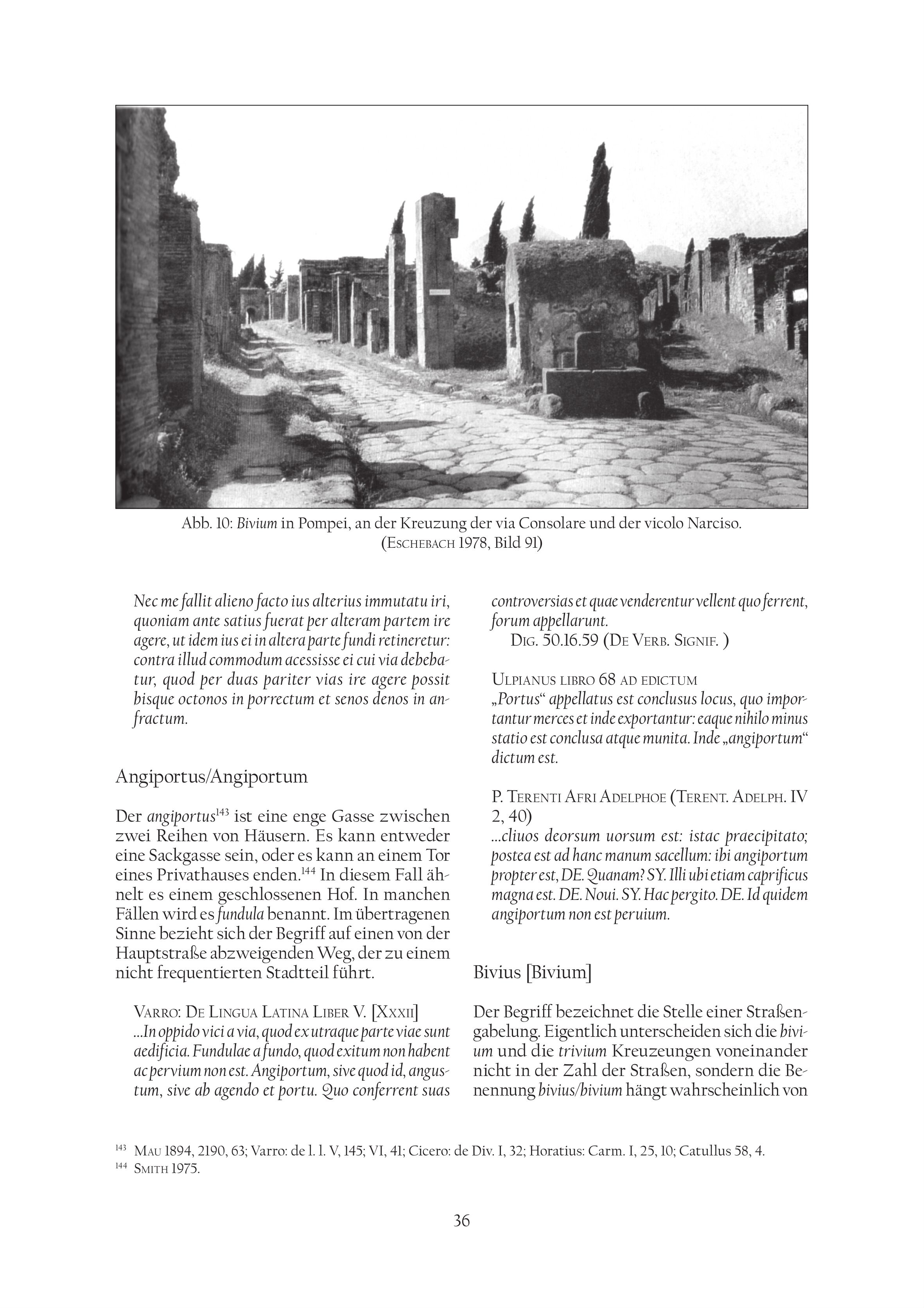 x Nec me fallit alieno facto ius alterius immutatu iri, quoniam ante satius fuerat per alteram partem ire agere, ut idem ius ei inaltera parte fundi retineretur: contra illud commodum acessisse ei cui via debebatur, quod per duds pariter vias ire agere possit bisque octonos in porrectum et senos denos in anfractum. Angiportus/Angiportum Der angiportus'” ist eine enge Gasse zwischen zwei Reihen von Häusern. Es kann entweder eine Sackgasse sein, oder es kann an einem Tor eines Privathauses enden.“* In diesem Fall ähnelt es einem geschlossenen Hof. In manchen Fällen wird es fundula benannt. Im übertragenen Sinne bezieht sich der Begriff auf einen von der Hauptstraße abzweigenden Weg, der zu einem nicht frequentierten Stadtteil führt. VARRO: DE LiNGUA LATINA LIBEr V. [Xxxt] ..Inoppido vici a via, quod exutraque parte viae sunt aedificia. Fundulae afundo, quod exitum non habent ac pervium non est. Angiportum, sive quod id, angustum, sive ab agendo et portu. Quo conferrent suas controversias et quae venderentur vellent quo ferrent, forum appellarunt. Dic. 50.16.59 (DE VERB. SIGNIF. ) ULPIANUS LIBRO 68 AD EDICTUM „Portus“ appellatus est conclusus locus, quo impor tantur merces et inde exportantur: eaque nihilo minus statio est conclusa atque munita. Inde ,angiportum* dictum est. P. TERENTI AFRI ADELPHOE (TERENT. ADELPH. IV 2, 40) ..cliuos deorsum uorsum est: istac praecipitato; posted est ad hanc manum sacellum: ibi angiportum propter est, DE. Quanam? SY. Illi ubietiam caprificus magna est. DE. Noui. SY. Hac pergito. DE. Id quidem angiportum non est peruium. Bivius [Bivium] Der Begriff bezeichnet die Stelle einer Straßengabelung. Eigentlich unterscheiden sich die bivium und die trivium Kreuzeungen voneinander nicht in der Zahl der Straßen, sondern die Benennung bivius/bivium hängt wahrscheinlich von 144 SMITH 1975. 36