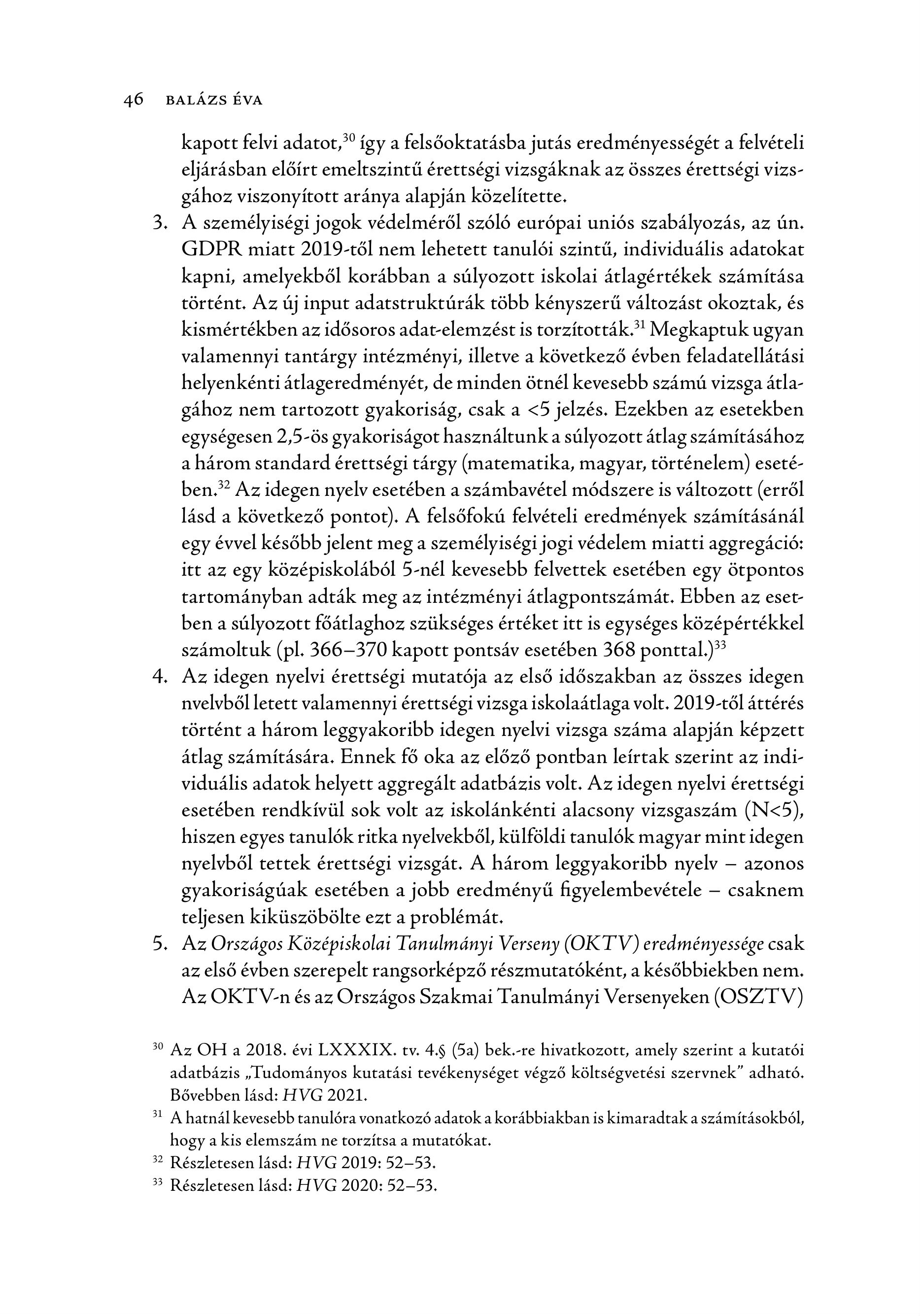 46 30 31 32 33 kapott felvi adatot, " így a felsőoktatásba jutás eredményességét a felvételi eljárásban előírt emeltszintű érettségi vizsgáknak az összes érettségi vizsgához viszonyított aránya alapján közelítette. A személyiségi jogok védelméről szóló európai uniós szabályozás, az ún. GDPR miatt 2019-töl nem lehetett tanulói szintű, individuális adatokat kapni, amelyekböl koräbban a sülyozott iskolai ätlagertekek szämitäsa történt. Az új input adatstruktúrák több kényszerű változást okoztak, és kismértékben az idősoros adat-elemzést is torzították. ! Megkaptuk ugyan valamennyi tantárgy intézményi, illetve a következő évben feladatellátási helyenkénti átlageredményét, de minden ötnél kevesebb számú vizsga átlagához nem tartozott gyakoriság, csak a c5 jelzés. Ezekben az esetekben egységesen 2,5-ös gyakoriságot használtunk a súlyozott átlag számításához a három standard érettségi tárgy (matematika, magyar, történelem) esetében.? Az idegen nyelv esetében a számbavétel módszere is változott (erről lásd a következő pontot). A felsőfokú felvételi eredmények számításánál egy évvel később jelent meg a személyiségi jogi védelem miatti aggregáció: itt az egy középiskolából 5-nél kevesebb felvettek esetében egy ötpontos tartományban adták meg az intézményi átlagpontszámát. Ebben az esetben a súlyozott főátlaghoz szükséges értéket itt is egységes középértékkel szämoltuk (pl. 366-370 kapott pontsäv eseteben 368 ponttal.)” Az idegen nyelvi érettségi mutatója az első időszakban az összes idegen nvelvből letett valamennyi érettségi vizsga iskolaátlaga volt. 2019-től áttérés történt a három leggyakoribb idegen nyelvi vizsga száma alapján képzett átlag számítására. Ennek fő oka az előző pontban leírtak szerint az individuális adatok helyett aggregált adatbázis volt. Az idegen nyelvi érettségi esetében rendkívül sok volt az iskolankénti alacsony vizsgaszam (N<5), hiszen egyes tanulók ritka nyelvekből, külföldi tanulók magyar mint idegen nyelvből tettek érettségi vizsgát. A három leggyakoribb nyelv — azonos gyakoriságúak esetében a jobb eredményű figyelembevétele — csaknem teljesen kiküszöbölte ezt a problémát. Az Országos Középiskolai Tanulmányi Verseny (OKT V) eredményessége csak az első évben szerepelt rangsorképző részmutatóként, a későbbiekben nem. Az OKI Vin és az Országos Szakmai Tanulmányi Versenyeken (OSZT V) Az OH a 2018. évi LXXXIX. tv. 4.§ (5a) bek.-re hivatkozott, amely szerint a kutatói adatbázis , Iudományos kutatási tevékenységet végző költségvetési szervnek" adható. Bővebben lásd: HVG 2021. A hatnál kevesebb tanulóra vonatkozó adatok a korábbiakban is kimaradtak a számításokból, hogy a kis elemszám ne torzítsa a mutatókat. Reszletesen läsd: HVG 2019: 52-53. Reszletesen läsd: HVG 2020: 52-53.