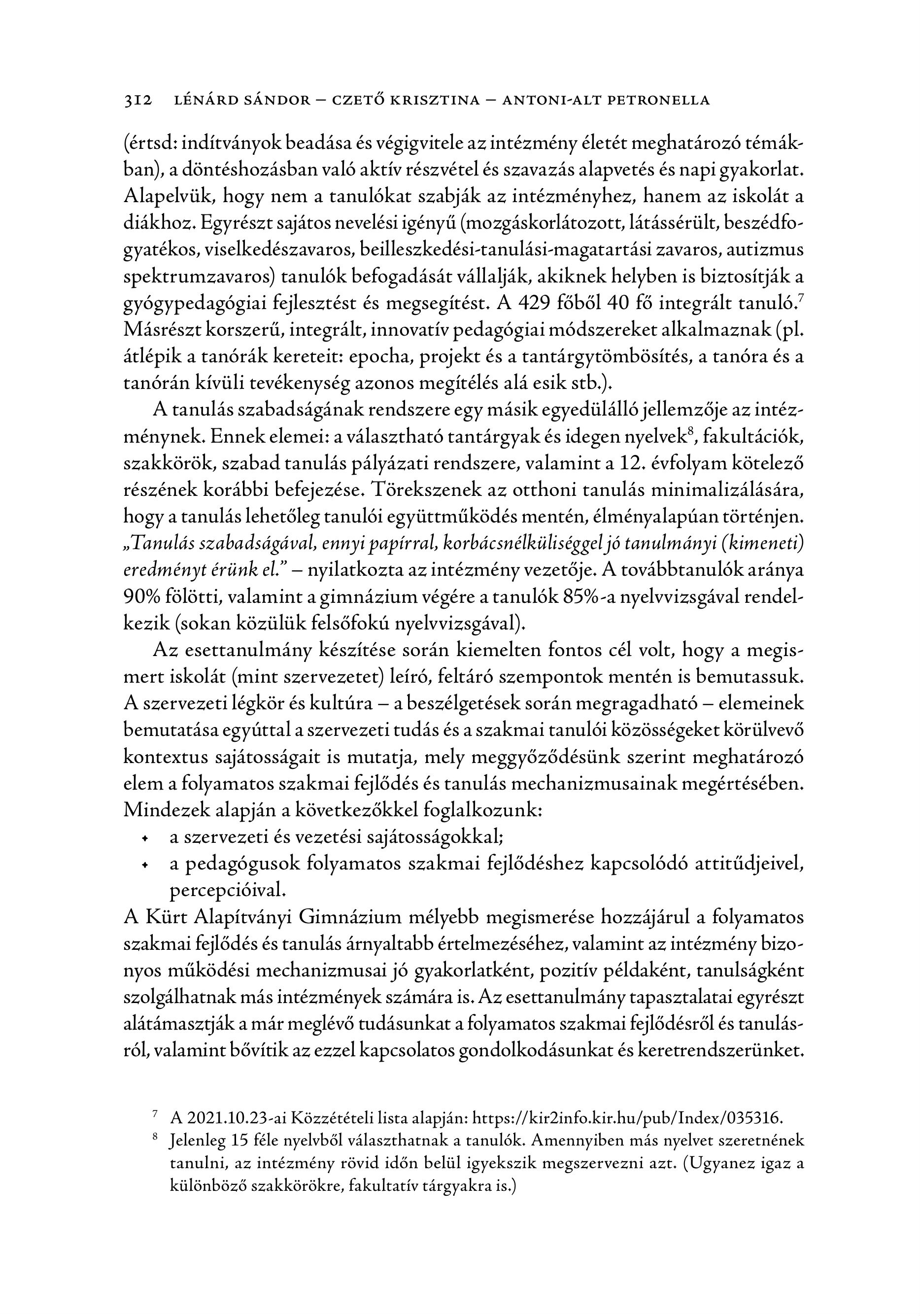 3I2 LÉNÁRD SÁNDOR — CZETŐ KRISZTINA — ANTONI-ALT PETRONELLA (értsd: indítványok beadása és végigvitele az intézmény életét meghatározó témákban), a döntéshozásban való aktív részvétel és szavazás alapvetés és napi gyakorlat. Alapelvük, hogy nem a tanulókat szabják az intézményhez, hanem az iskolát a diákhoz. Egyrészt sajátos nevelési igényű (mozgáskorlátozott, látássérült, beszédfogyatékos, viselkedészavaros, beilleszkedési-tanulási-magatartási zavaros, autizmus spektrumzavaros) tanulók befogadását vállalják, akiknek helyben is biztosítják a gyógypedagógiai fejlesztést és megsegítést. A 429 főből 40 fő integrált tanuló." Másrészt korszerű, integrált, innovatív pedagógiai módszereket alkalmaznak (pl. átlépik a tanórák kereteit: epocha, projekt és a tantárgytömbösítés, a tanóra és a tanórán kívüli tevékenység azonos megítélés alá esik stb.). A tanulás szabadságának rendszere egy másik egyedülálló jellemzője az intézménynek. Ennek elemei: a választható tantárgyak és idegen nyelvek°, fakultációk, szakkörök, szabad tanulás pályázati rendszere, valamint a 12. évfolyam kötelező részének korábbi befejezése. Térekszenek az otthoni tanulás minimalizálására, hogy a tanulás lehetőleg tanulói együttműködés mentén, élményalapúan történjen. s Tanulás szabadságával, ennyi papírral, korbácsnélküliséggel jó tanulmányi (kimeneti) eredményt érünk el." — nyilatkozta az intézmény vezetője. A továbbtanulók aránya 9096 fölötti, valamint a gimnázium végére a tanulók 8596-a nyelvvizsgával rendelkezik (sokan közülük felsőfokú nyelvvizsgával). Az esettanulmány készítése során kiemelten fontos cél volt, hogy a megismert iskolát (mint szervezetet) leíró, feltáró szempontok mentén is bemutassuk. A szervezeti légkör és kultúra — a beszélgetések során megragadható — elemeinek bemutatása egyúttal a szervezeti tudás és a szakmai tanulói közösségeket körülvevő kontextus sajátosságait is mutatja, mely meggyőződésünk szerint meghatározó elem a folyamatos szakmai fejlődés és tanulás mechanizmusainak megértésében. Mindezek alapján a következőkkel foglalkozunk: + a szervezeti és vezetési sajátosságokkal; + a pedagógusok folyamatos szakmai fejlődéshez kapcsolódó attitűdjeivel, percepcióival. A Kürt Alapítványi Gimnázium mélyebb megismerése hozzájárul a folyamatos szakmai fejlődés és tanulás árnyaltabb értelmezéséhez, valamint az intézmény bizonyos működési mechanizmusai jó gyakorlatként, pozitív példaként, tanulságként szolgálhatnak más intézmények számára is. Az esettanulmány tapasztalatai egyrészt alátámasztják a már meglévő tudásunkat a folyamatos szakmai fejlődésről és tanulásról, valamint bővítik az ezzel kapcsolatos gondolkodásunkat és keretrendszerünket. ” A 2021.10.23-ai Közzeteteli lista alapjän: https://kir2info.kir.hu/pub/Index/035316. ® Jelenleg 15 fele nyelvböl välaszthatnak a tanulók. Amennyiben más nyelvet szeretnének tanulni, az intézmény rövid időn belül igyekszik megszervezni azt. (Ugyanez igaz a különböző szakkörökre, fakultatív tárgyakra is.)