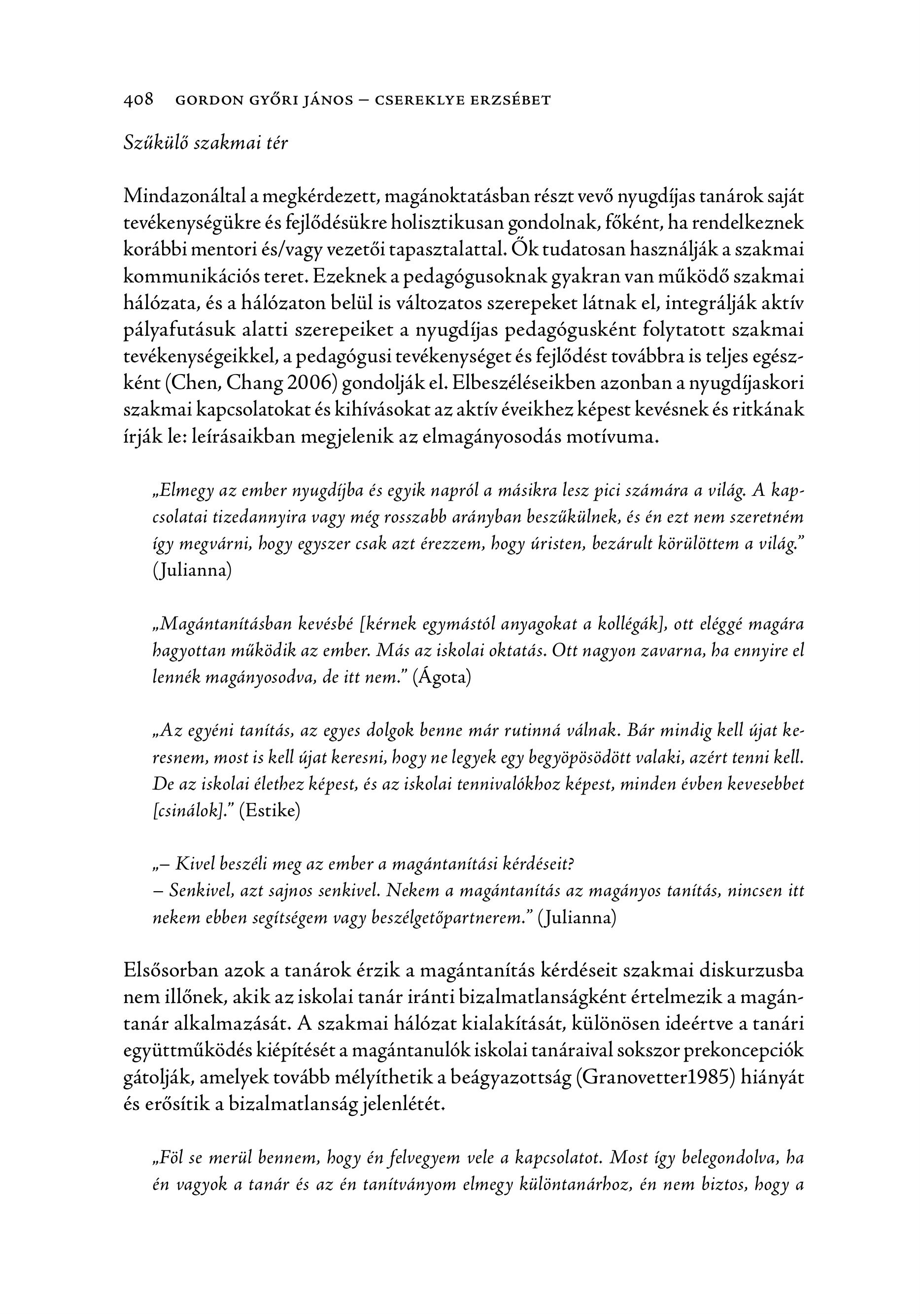 408 GORDON GYŐRI JÁNOS — CSEREKLYE ERZSÉBET Szűkülő szakmai tér Mindazonáltal a megkérdezett, magánoktatásban részt vevő nyugdíjas tanárok saját tevékenységükre és fejlődésükre holisztikusan gondolnak, főként, ha rendelkeznek korábbi mentori és/vagy vezetői tapasztalattal. Ők tudatosan használják a szakmai kommunikációs teret. Ezeknek a pedagógusoknak gyakran van működő szakmai hálózata, és a hálózaton belül is változatos szerepeket látnak el, integrálják aktív pályafutásuk alatti szerepeiket a nyugdíjas pedagógusként folytatott szakmai tevékenységeikkel, a pedagógusi tevékenységet és fejlődést továbbra is teljes egészként (Chen, Chang 2006) gondolják el. Elbeszéléseikben azonban a nyugdíjaskori szakmai kapcsolatokat és kihívásokat az aktív éveikhez képest kevésnek és ritkának irjäk le: leiräsaikban megjelenik az elmagänyosodäs motivuma. , Elmegy az ember nyugdíjba és egyik napról a másikra lesz pici számára a világ. A kapcsolatai tizedannyira vagy még rosszabb arányban beszűkülnek, és én ezt nem szeretném így megvárni, hogy egyszer csak azt érezzem, bogy úristen, bezárult körülöttem a világ." (Julianna) , Magántanításban kevésbé [kérnek egymástól anyagokat a kollégák], ott eléggé magára hagyottan működik az ember. Más az iskolai oktatás. Ott nagyon zavarna, ba ennyire el lennék magányosodva, de itt nem." (Ágota) , Az egyéni tanítás, az egyes dolgok benne már rutinná válnak. Bár mindig kell újat keresnem, most is kell újat keresni, hogy ne legyek egy begyöpösödött valaki, azért tenni kell. De az iskolai élethez képest, és az iskolai tennivalókboz képest, minden évben kevesebbet [csinálok]." (Estike) ,— Kivel beszéli meg az ember a magántanítási kérdéseit? — Senkivel, azt sajnos senkivel. Nekem a magántanítás az magányos tanítás, nincsen itt nekem ebben segítségem vagy beszélgetőpartnerem." (Julianna) Elsősorban azok a tanárok érzik a magántanítás kérdéseit szakmai diskurzusba nem illőnek, akik az iskolai tanár iránti bizalmatlanságként értelmezik a magántanár alkalmazását. A szakmai hálózat kialakítását, különösen ideértve a tanári együttműködés kiépítését a magántanulók iskolai tanáraival sokszor prekoncepciók gátolják, amelyek tovább mélyíthetik a beágyazottság (Granovetter1985) hiányát és erősítik a bizalmatlanság jelenlétét. , Föl se merül bennem, bogy én felvegyem vele a kapcsolatot. Most így belegondolva, ha én vagyok a tanár és az én tanítványom elmegy különtanárboz, én nem biztos, hogy a