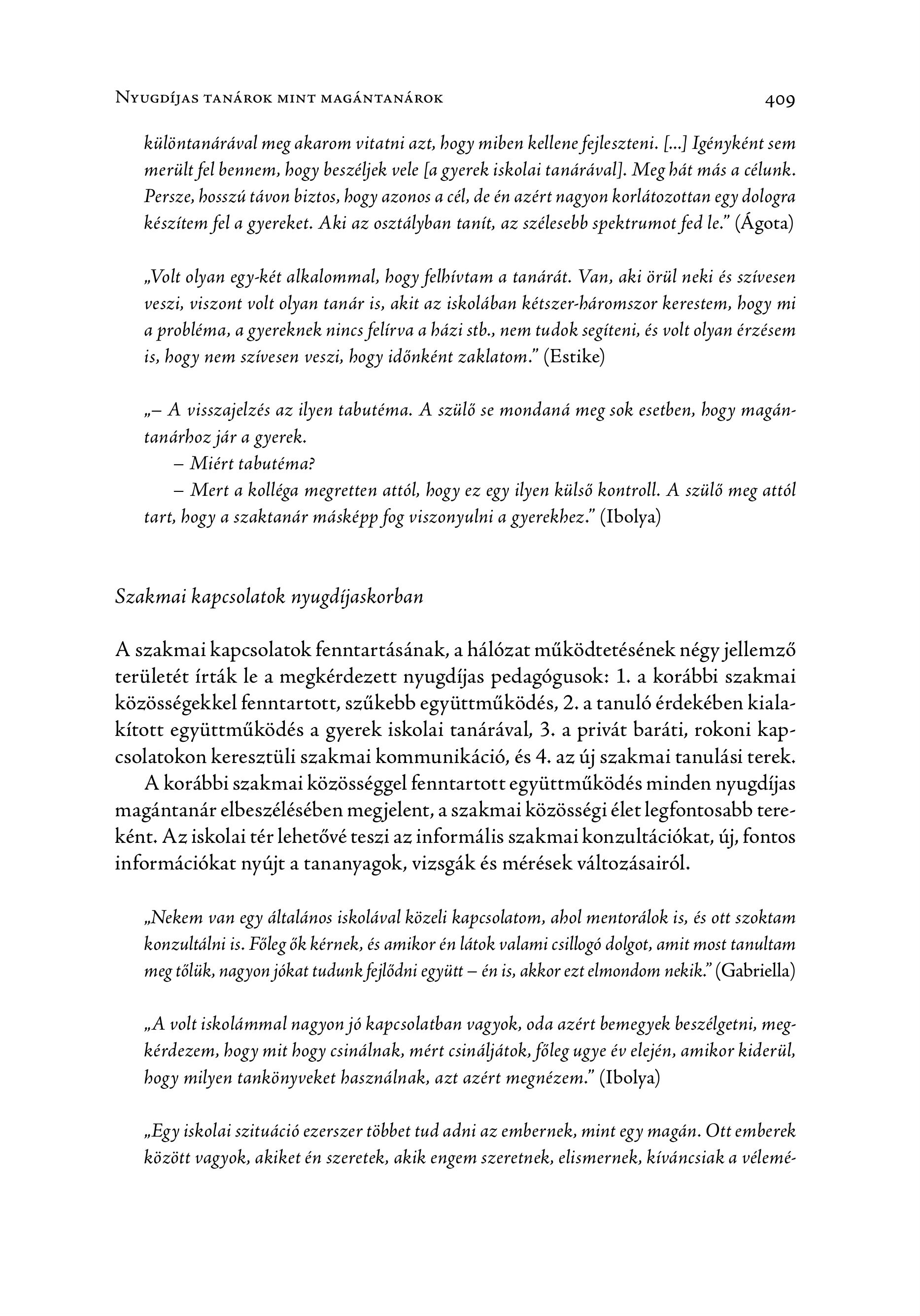 NYUGDÍJAS TANÁROK MINT MAGÁNTANÁROK 409 különtanárával meg akarom vitatni azt, hogy miben kellene fejleszteni. [...] Igényként sem merült fel bennem, hogy beszéljek vele [a gyerek iskolai tanárával]. Meg bát más a célunk. Persze, hosszú távon biztos, hogy azonos a cél, de én azért nagyon korlátozottan egy dologra ” készítem fel a gyereket. Aki az osztályban tanít, az szélesebb spektrumot fed le." (Ágota) „Volt olyan egy-két alkalommal, bogy felhívtam a tanárát. Van, aki örül neki és szívesen veszi, viszont volt olyan tanár is, akit az iskolában kétszer-báromszor kerestem, hogy mi a probléma, a gyereknek nincs felírva a bázi stb., nem tudok segíteni, és volt olyan érzésem is, hogy nem szívesen veszi, hogy időnként zaklatom." (Estike) y A visszajelzés az ilyen tabutéma. A szülő se mondaná meg sok esetben, hogy magántanárboz jár a gyerek. — Miért tabutéma? — Mert a kolléga megretten attól, hogy ez egy ilyen külső kontroll. A szülő meg attól tart, hogy a szaktandr másképp fog viszonyulni a gyerekbez." (Ibolya) Szakmai kapcsolatok nyugdíjaskorban A szakmai kapcsolatok fenntartásának, a hálózat működtetésének négy jellemző területét írták le a megkérdezett nyugdíjas pedagógusok: 1. a korábbi szakmai közösségekkel fenntartott, szűkebb együttműködés, 2. a tanuló érdekében kialakított együttműködés a gyerek iskolai tanárával, 3. a privát baráti, rokoni kapcsolatokon keresztüli szakmai kommunikáció, és 4. az új szakmai tanulási terek. A korábbi szakmai közösséggel fenntartott együttműködés minden nyugdíjas magántanár elbeszélésében megjelent, a szakmai közösségi élet legfontosabb tereként. Az iskolai tér lehetővé teszi az informális szakmai konzultációkat, új, fontos információkat nyújt a tananyagok, vizsgák és mérések változásairól. »Nekem van egy általános iskolával közeli kapcsolatom, abol mentorálok is, és ott szoktam konzultálni is. Főleg ők kérnek, és amikor én látok valami csillogó dolgot, amit most tanultam meg tőlük, nagyon jókat tudunk fejlődni együtt — én is, akkor ezt elmondom nekik." (Gabriella) „A volt iskolámmal nagyon jó kapcsolatban vagyok, oda azért bemegyek beszélgetni, megkérdezem, bogy mit bogy csinálnak, mért csináljátok, főleg ugye év elején, amikor kiderül, ” bogy milyen tankönyveket használnak, azt azért megnézem." (Ibolya) , Egy iskolai szituáció ezerszer többet tud adni az embernek, mint egy magán. Ott emberek között vagyok, akiket én szeretek, akik engem szeretnek, elismernek, kíváncsiak a vélemé