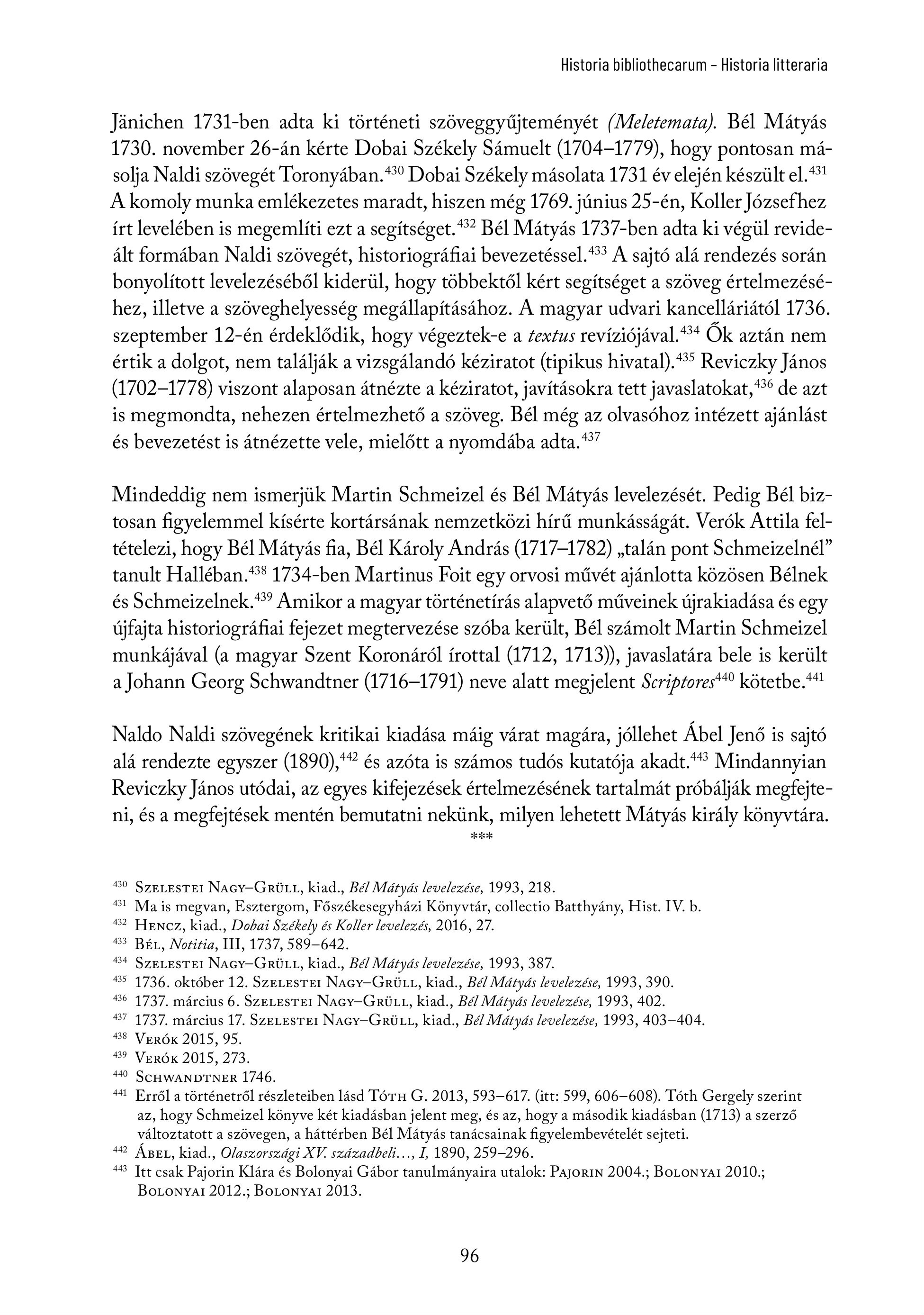 Historia bibliothecarum - Historia litteraria Jänichen 1731-ben adta ki törteneti szöveggyüjtemenyet (Meletemata). Bel Mätyäs 1730. november 26-an kérte Dobai Székely Samuelt (1704-1779), hogy pontosan mäsolja Naldi szôvegét Toronyäban.“° Dobai Székely másolata 1731 év elején készült el." A komoly munka emlékezetes maradt, hiszen még 1769. június 25-én, Koller Józsefhez írt levelében is megemlíti ezt a segítséget.?? Bél Mátyás 1737-ben adta ki végül revideált formában Naldi szövegét, historiográfiai bevezetéssel. A sajtó alá rendezés során bonyolított levelezéséből kiderül, hogy többektől kért segítséget a szöveg értelmezéséhez, illetve a szöveghelyesség megállapításához. A magyar udvari kancelláriától 1736. szeptember 12-én érdeklődik, hogy végeztek-e a fexfus revíziójával.81 Ők aztán nem értik a dolgot, nem találják a vizsgálandó kéziratot (tipikus hivatal). Reviczky János (1702-1778) viszont alaposan átnézte a kéziratot, javításokra tett javaslatokat, § de azt is megmondta, nehezen értelmezhető a szöveg. Bél még az olvasóhoz intézett ajánlást és bevezetést is átnézette vele, mielőtt a nyomdába adta." Mindeddig nem ismerjük Martin Schmeizel és Bél Mátyás levelezését. Pedig Bél biztosan figyelemmel kísérte kortársának nemzetközi hírű munkásságát. Verók Attila feltételezi, hogy Bél Mátyás fia, Bél Károly András (1717-1782) „talän pont Schmeizelnel” tanult Halléban." 1734-ben Martinus Foit egy orvosi művét ajánlotta közösen Bélnek és Schmeizelnek."? Amikor a magyar történetírás alapvető műveinek újrakiadása és egy újfajta historiográfiai fejezet megtervezése szóba került, Bél számolt Martin Schmeizel munkájával (a magyar Szent Koronáról írottal (1712, 1713)), javaslatára bele is került a Johann Georg Schwandtner (1716—-1791) neve alatt megjelent Scripzrores"" kötetbe." Naldo Naldi szövegének kritikai kiadása máig várat magára, jóllehet Ábel Jenő is sajtó alá rendezte egyszer (1890), és azóta is számos tudós kutatója akadt." Mindannyian Reviczky János utódai, az egyes kifejezések értelmezésének tartalmát próbálják megfejteni, és a megfejtések mentén bemutatni nekünk, milyen lehetett Mátyás király könyvtára. AE 30 SZELESTEI NAGY-GRÜLL, kiad., Bél Mátyás levelezése, 1993, 218. Ma is megvan, Esztergom, Főszékesegyházi Könyvtár, collectio Batthyány, Hist. IV. b. #2 Hencz, kiad., Dobai Szekely es Koller levelezes, 2016, 27. #3 Ber, Nofitia, III, 1737, 589-642. #4 SZELESTEI NAcy-GrÜLL, kiad., Be/ Matyas levelezese, 1993, 387. 35 1736. október 12. SZELESTEI NAGY-GRÜLL, kiad., Bél Mátyás levelezése, 1993, 390. 36 1737. március 6. SZELESTEI NAGY—GRÜLL, kiad., Bél Mátyás levelezése, 1993, 402. #7 1737. märcius 17. SZELESTEI NAGY-GRÜLL, kiad., Bél Mátyás levelezése, 1993, 403—404. #8 VERÖK 2015, 95. #9 VERÖR 2015, 273. SCHWANDTNER 1746. #1 Erről a történetről részleteiben lásd TórH G. 2013, 593—617. (itt: 599, 606—608). Tóth Gergely szerint az, hogy Schmeizel könyve két kiadásban jelent meg, és az, hogy a második kiadásban (1713) a szerző változtatott a szövegen, a háttérben Bél Mátyás tanácsainak figyelembevételét sejteti. 42 ÁBEL, kiad., Olaszorszagi XV. szazadbeli..., I, 1890, 259-296. Itt csak Pajorin Klára és Bolonyai Gábor tanulmányaira utalok: Payorın 2004.; BoLonyaı 2010.; BOLONYAI1 2012.; BoLoNYA1 2013. 96