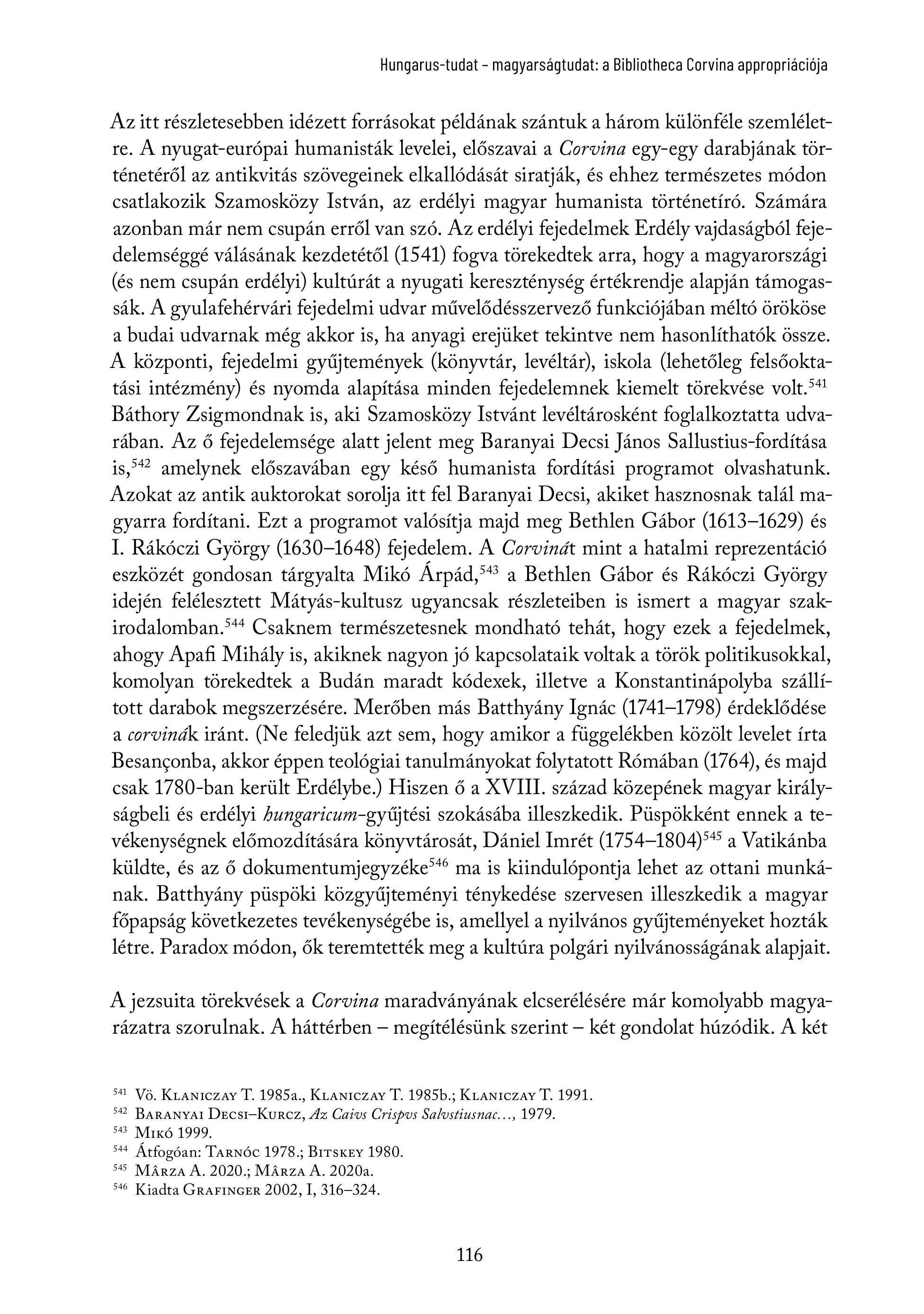 Az itt részletesebben idézett forrásokat példának szántuk a három különféle szemléletre. A nyugat-európai humanisták levelei, előszavai a Corvina egy-egy darabjának történetéről az antikvitás szövegeinek elkallódását siratják, és ehhez természetes módon csatlakozik Szamosközy István, az erdélyi magyar humanista történetíró. Számára azonban már nem csupán erről van szó. Az erdélyi fejedelmek Erdély vajdaságból fejedelemséggé válásának kezdetétől (1541) fogva törekedtek arra, hogy a magyarországi (és nem csupán erdélyi) kultúrát a nyugati kereszténység értékrendje alapján támogassák. A gyulafehérvári fejedelmi udvar művelődésszervező funkciójában méltó örököse a budai udvarnak még akkor is, ha anyagi erejüket tekintve nem hasonlíthatók össze. A központi, fejedelmi gyűjtemények (könyvtár, levéltár), iskola (lehetőleg felsőoktatási intézmény) és nyomda alapítása minden fejedelemnek kiemelt törekvése volt." Báthory Zsigmondnak is, aki Szamosközy Istvánt levéltárosként foglalkoztatta udvarában. Az ő fejedelemsége alatt jelent meg Baranyai Decsi János Sallustius-fordítása is,’ amelynek előszavában egy késő humanista fordítási programot olvashatunk. Azokat az antik auktorokat sorolja itt fel Baranyai Decsi, akiket hasznosnak talál magyarra fordítani. Ezt a programot valósítja majd meg Bethlen Gábor (1613-1629) és I. Rákóczi György (1630-1648) fejedelem. A Corvinát mint a hatalmi reprezentáció eszközét gondosan tárgyalta Mikó Arpad, a Bethlen Gábor és Rákóczi György idején felélesztett Mátyás-kultusz ugyancsak részleteiben is ismert a magyar szakirodalomban." Csaknem természetesnek mondható tehát, hogy ezek a fejedelmek, ahogy Apafi Mihály is, akiknek nagyon jó kapcsolataik voltak a török politikusokkal, komolyan törekedtek a Budán maradt kódexek, illetve a Konstantinápolyba szállított darabok megszerzésére. Merőben más Batthyány Ignác (1741-1798) érdeklődése a corvinák iránt. (Ne feledjük azt sem, hogy amikor a függelékben közölt levelet írta Besanconba, akkor éppen teológiai tanulmányokat folytatott Rómában (1764), és majd csak 1780-ban került Erdélybe.) Hiszen ő a XVIII. század közepének magyar királysâgbeli és erdélyi hungaricum-gyüjtési szokäsäba illeszkedik. Püspökkent ennek a tevékenységnek előmozdítására könyvtárosát, Dániel Imrét (1754-1804)%% à Vatikänba küldte, és az ő dokumentumjegyzéke"" ma is kiindulópontja lehet az ottani munkának. Batthyány püspöki közgyűjteményi ténykedése szervesen illeszkedik a magyar főpapság következetes tevékenységébe is, amellyel a nyilvános gyűjteményeket hozták létre. Paradox módon, ők teremtették meg a kultúra polgári nyilvánosságának alapjait. A jezsuita törekvések a Corvina maradványának elcserélésére már komolyabb magyarázatra szorulnak. A háttérben — megítélésünk szerint — két gondolat húzódik. A két 54 Vo. KLaniczAy T. 1985a., KLaniczay T. 1985b.; KLaniczay T. 1991. 52 BARANYAI DEcsI-KuRkcz, Az Caivs Crispvs Salvstiusnac..., 1979. 58 Mir 1999. 54 Âtfogéan: Tarnôc 1978; Brrskey 1980. 55 MARZA A. 2020.; MArza A. 2020a. 546 Kiadta GRAFINGER 2002, I, 316-324. 116