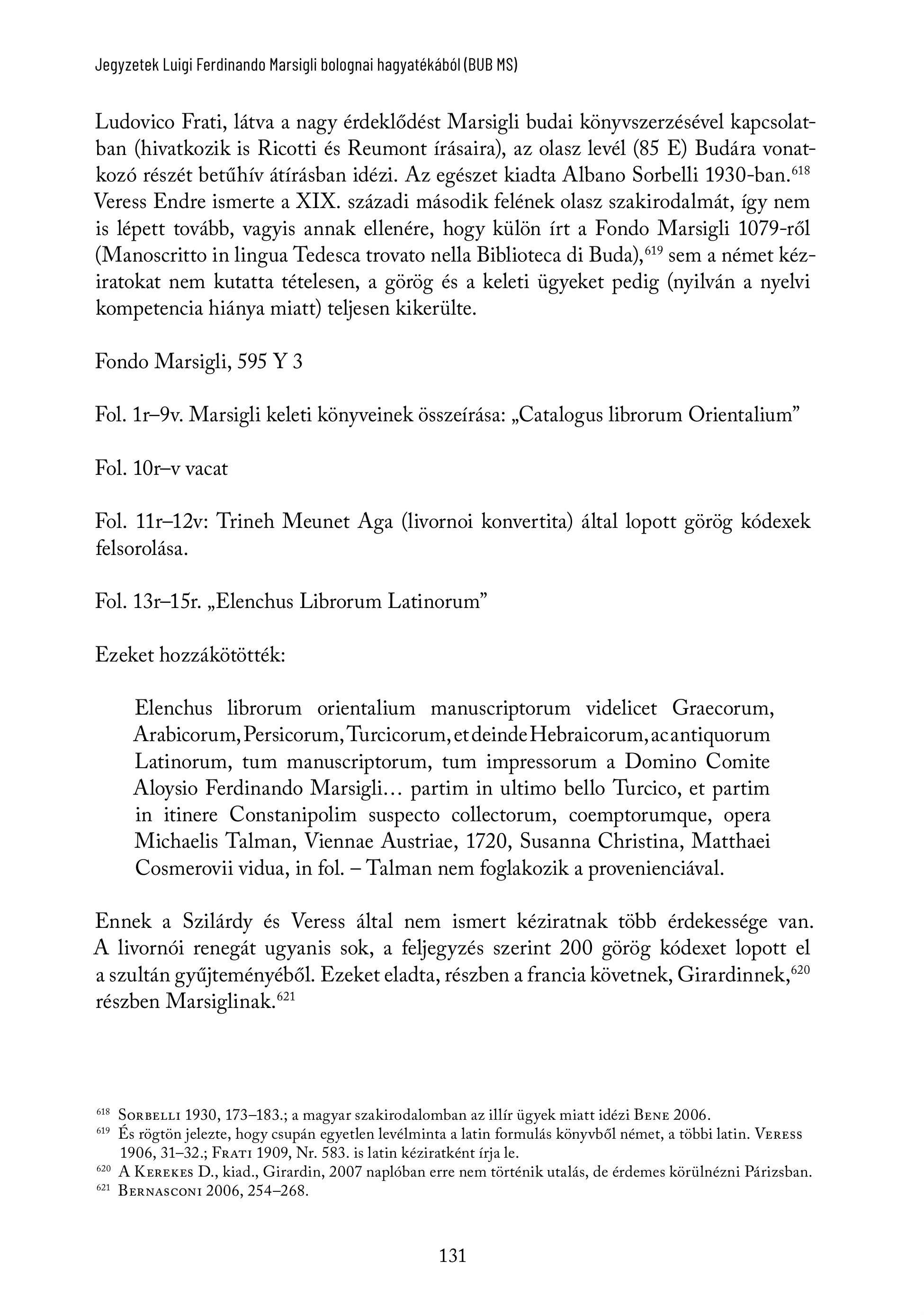 Jegyzetek Luigi Ferdinando Marsigli bolognai hagyatékából (BUB MS) Ludovico Frati, látva a nagy érdeklődést Marsigli budai könyvszerzésével kapcsolatban (hivatkozik is Ricotti és Reumont írásaira), az olasz levél (85 E) Budára vonatkozó részét betűhív átírásban idézi. Az egészet kiadta Albano Sorbelli 1930-ban." Veress Endre ismerte a XIX. századi második felének olasz szakirodalmát, így nem is lépett tovább, vagyis annak ellenére, hogy külön írt a Fondo Marsigli 1079-röl (Manoscritto in lingua Tedesca trovato nella Biblioteca di Buda), " sem a német kéziratokat nem kutatta tételesen, a görög és a keleti ügyeket pedig (nyilván a nyelvi kompetencia hiánya miatt) teljesen kikerülte. Fondo Marsigli, 595 Y 3 Fol. 1r-9v. Marsigli keleti könyveinek összeírása: , Catalogus librorum Orientalium" Fol. 10r-v vacat Fol. 11r-12v: Trineh Meunet Aga (livornoi konvertita) ältal lopott görög ködexek felsoroläsa. Fol. 13r-15r. „Elenchus Librorum Latinorum” Ezeket hozzäkötöttek: Elenchus librorum orientalium manuscriptorum videlicet Graecorum, Arabicorum, Persicorum, Turcicorum, et deinde Hebraicorum, acantiquorum Latinorum, tum manuscriptorum, tum impressorum a Domino Comite Aloysio Ferdinando Marsigli... partim in ultimo bello Turcico, et partim in itinere Constanipolim suspecto collectorum, coemptorumque, opera Michaelis Talman, Viennae Austriae, 1720, Susanna Christina, Matthaei Cosmerovii vidua, in fol. - Talman nem foglakozik a provenienciäval. Ennek a Szilárdy és Veress által nem ismert kéziratnak több érdekessége van. A livornói renegát ugyanis sok, a feljegyzés szerint 200 görög kódexet lopott el a szultán gyűjteményéből. Ezeket eladta, részben a francia követnek, Girardinnek, részben Marsiglinak."? 618 SORBELLI 1930, 173-183.; a magyar szakirodalomban az illír ügyek miatt idézi BENE 2006. 619. És rögtön jelezte, hogy csupán egyetlen levélminta a latin formulás könyvből német, a többi latin. VEREss 1906, 31-32.; FRATI 1909, Nr. 583. is latin kéziratként frja le. 620 A Kerexes D., kiad., Girardin, 2007 naploban erre nem térténik utalds, de érdemes k6riiInézni Parizsban. 621 BERNASCONI 2006, 254-268. 131