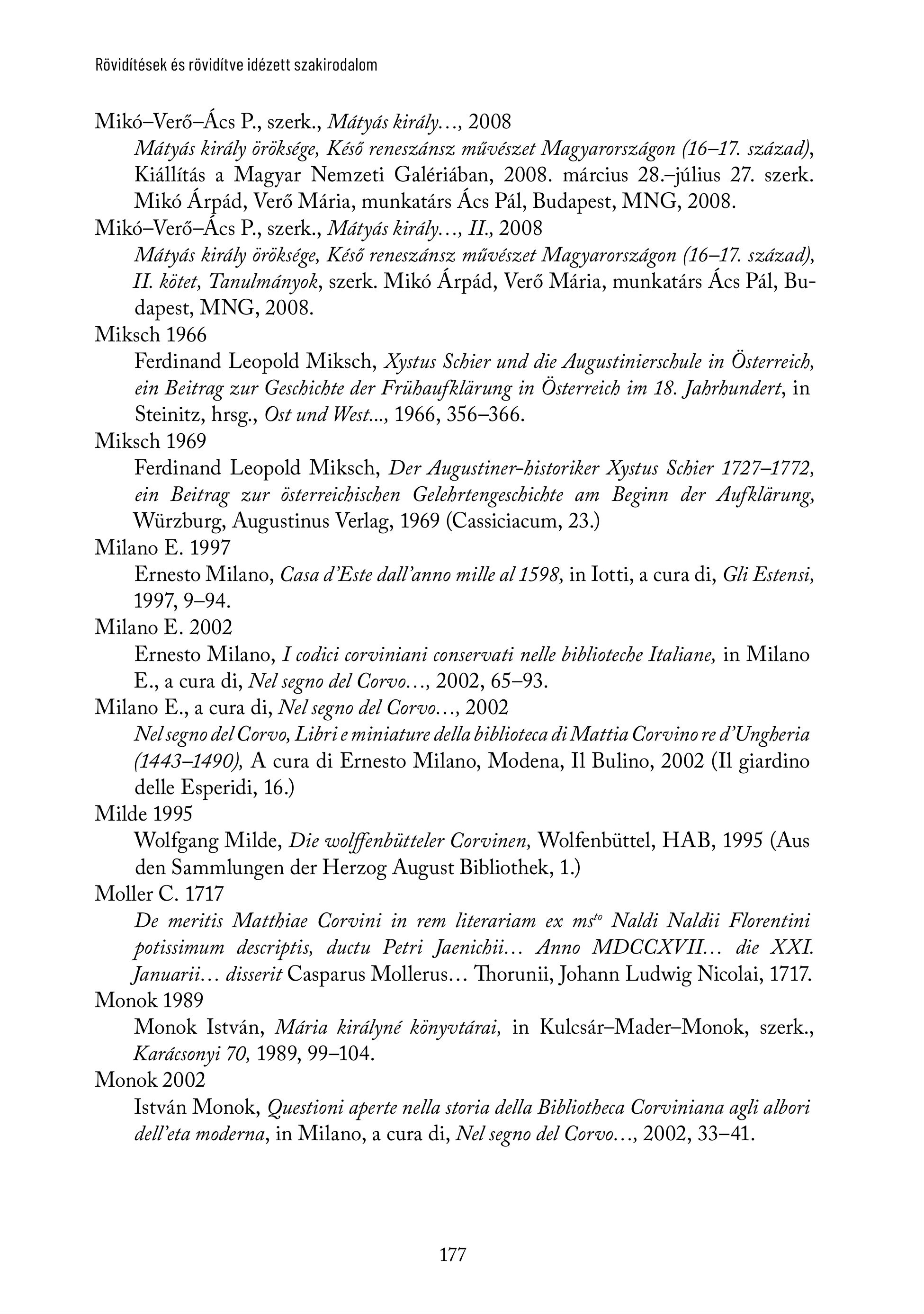 Rövidítések és rövidítve idézett szakirodalom Mikó-Verő-Ács P., szerk., Mátyás király. . ., 2008 Mátyás király öröksége, Késő reneszánsz művészet Magyarországon (16-17. század), Kiállítás a Magyar Nemzeti Galériában, 2008. március 28.—július 27. szerk. Mikó Árpád, Verő Mária, munkatárs Ács Pál, Budapest, MNG, 2008. Mikó-Verő-Ács P., szerk., Mátyás király. .., II., 2008 Mátyás király öröksége, Késő reneszánsz művészet Magyarországon (16-17. század), II. kötet, Tanulmányok, szerk. Mikó Árpád, Verő Mária, munkatárs Ács Pál, Budapest, MNG, 2008. Miksch 1966 Ferdinand Leopold Miksch, Xystus Schier und die Augustinierschule in Osterreich, ein Beitrag zur Geschichte der Frühaufklärung in Österreich im 18. Jahrhundert, in Steinitz, hrsg., Ost und West..., 1966, 356-366. Miksch 1969 Ferdinand Leopold Miksch, Der Augustiner-historiker Xystus Schier 1727-1772, ein Beitrag zur österreichischen Gelehrtengeschichte am Beginn der Aufklärung, Würzburg, Augustinus Verlag, 1969 (Cassiciacum, 23.) Milano E. 1997 Ernesto Milano, Casa d Este dall anno mille a! 1598, in Iotti, a cura di, Gli Estensi, 1997, 9-94. Milano E. 2002 Ernesto Milano, I codici corviniani conservati nelle biblioteche Italiane, in Milano E., a cura di, Ne/ segno del Corvo..., 2002, 65-93. Milano E., a cura di, Ne/ segno del Corvo..., 2002 Nel segno del Corvo, Libri e miniature della biblioteca di Mattia Corvino re d’Ungheria (1443-1490), A cura di Ernesto Milano, Modena, Il Bulino, 2002 (Il giardino delle Esperidi, 16.) Milde 1995 Wolfgang Milde, Die wolffenbütteler Corvinen, Wolfenbüttel, HAB, 1995 (Aus den Sammlungen der Herzog August Bibliothek, 1.) Moller C. 1717 De meritis Matthiae Corvini in rem literariam ex ms” Naldi Naldii Florentini potissimum descriptis, ductu Petri Jaenichii... Anno MDCCXVI... die XX1. Januarii... disserit Casparus Mollerus... Thorunii, Johann Ludwig Nicolai, 1717. Monok 1989 Monok István, Mária királyné könyvtárai, in Kulesar-Mader-Monok, szerk., Karácsonyi 70, 1989, 99-104. Monok 2002 István Monok, Ouestioni aperte nella storia della Bibliotheca Corviniana agli albori dell’eta moderna, in Milano, a cura di, Ne/ segno del Corvo..., 2002, 33-41. 177