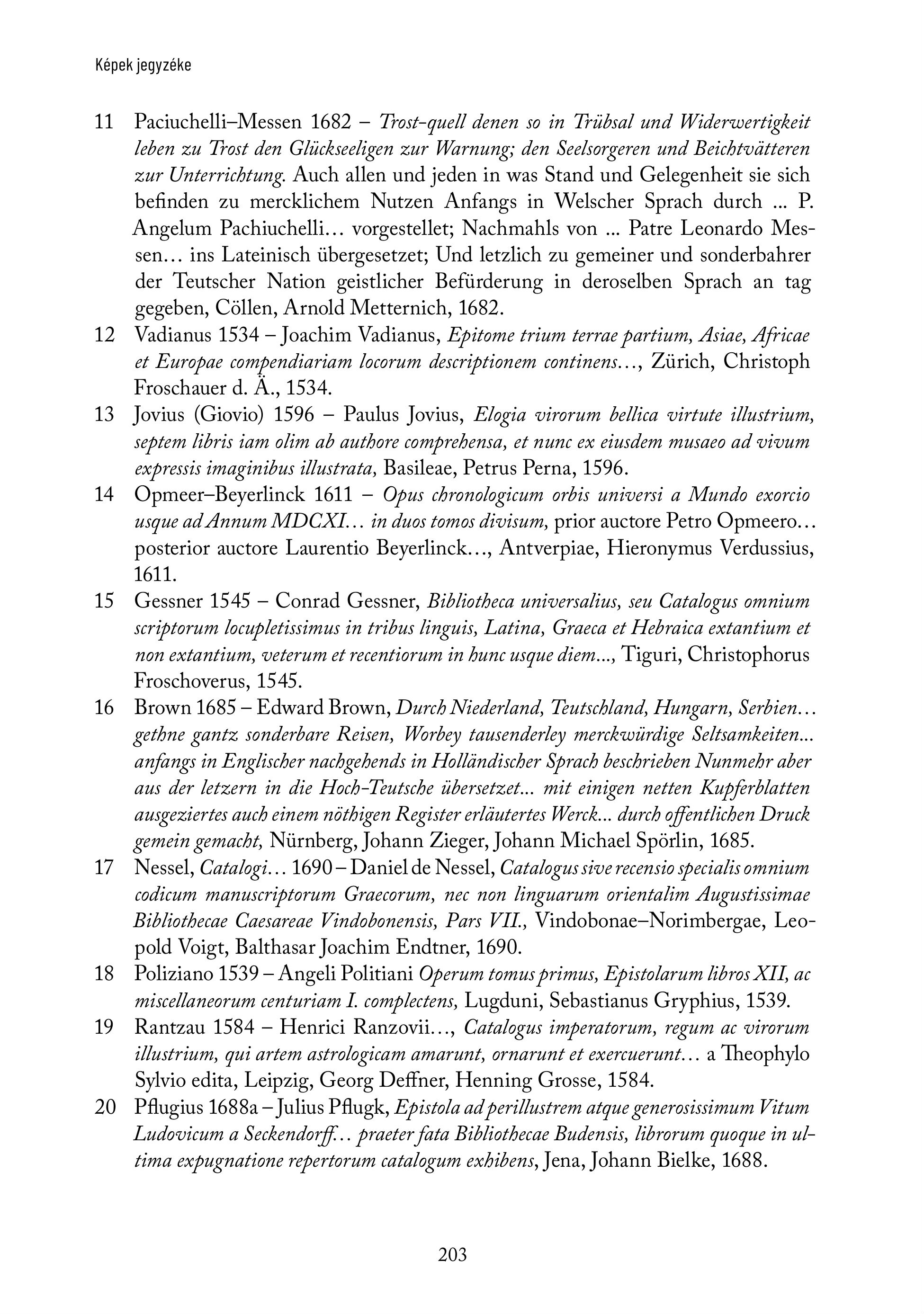 11 12 13 14 15 16 17 18 19 20 Paciuchelli-Messen 1682 — Trost-quell denen so in Triibsal und Widerwertigkeit leben zu Trost den Ghickseeligen zur Warnung; den Seelsorgeren und Beichtvätteren zur Unterrichtung. Auch allen und jeden in was Stand und Gelegenheit sie sich befinden zu mercklichem Nutzen Anfangs in Welscher Sprach durch ... P. Angelum Pachiuchelli... vorgestellet; Nachmahls von ... Patre Leonardo Messen... ins Lateinisch übergesetzet; Und letzlich zu gemeiner und sonderbahrer der Teutscher Nation geistlicher Befürderung in deroselben Sprach an tag gegeben, Cöllen, Arnold Metternich, 1682. Vadianus 1534 — Joachim Vadianus, Epitome trium terrae partium, Asiae, Africae et Europae compendiariam locorum descriptionem continens..., Zürich, Christoph Froschauer d. Ä., 1534. Jovius (Giovio) 1596 — Paulus Jovius, Elogia virorum bellica virtute illustrium, septem libris iam olim ab authore comprehensa, et nunc ex eiusdem musaeo ad vivum expressis imaginibus illustrata, Basileae, Petrus Perna, 1596. Opmeer-Beyerlinck 1611 — Opus chronologicum orbis universi a Mundo exorcio usque ad Annum MDCXI... in duos tomos divisum, prior auctore Petro Opmeero... posterior auctore Laurentio Beyerlinck..., Antverpiae, Hieronymus Verdussius, 1611. Gessner 1545 — Conrad Gessner, Bibliotheca universalius, seu Catalogus omnium scriptorum locupletissimus in tribus linguis, Latina, Graeca et Hebraica extantium et non extantium, veterum et recentiorum in hunc usque diem..., Tiguri, Christophorus Froschoverus, 1545. Brown 1685 — Edward Brown, Durch Niederland, Teutschland, Hungarn, Serbien... gethne gantz sonderbare Reisen, Worbey tausenderley merckwürdige Seltsamkeiten... anfangs in Englischer nachgehends in Holländischer Sprach beschrieben Nunmehr aber aus der letzern in die Hoch-Teutsche übersetzet... mit einigen netten Kupferblatten ausgeziertes auch einem nöthigen Register erläutertes Werck... durch offentlichen Druck gemein gemacht, Nürnberg, Johann Zieger, Johann Michael Spörlin, 1685. Nessel, Catalogi... 1690 — Daniel de Nessel, Cafalogus sive recensio specialis omnium codicum manuscriptorum Graecorum, nec non linguarum orientalim Augustissimae Bibliothecae Caesareae Vindobonensis, Pars VII, Vindobonae—Norimbergae, Leopold Voigt, Balthasar Joachim Endtner, 1690. Poliziano 1539 - Angeli Politiani Operum tomus primus, Epistolarum libros XII, ac miscellaneorum centuriam I. complectens, Lugduni, Sebastianus Gryphius, 1539. Rantzau 1584 — Henrici Ranzovii..., Catalogus imperatorum, regum ac virorum illustrium, qui artem astrologicam amarunt, ornarunt et exercuerunt... a Theophylo Sylvio edita, Leipzig, Georg Deffner, Henning Grosse, 1584. Pflugius 1688a - Julius Pflugk, Epistola ad perillustrem atque generosissimum Vitum Ludovicum a Seckendorff... praeter fata Bibliothecae Budensis, librorum quoque in ultima expugnatione repertorum catalogum exhibens, Jena, Johann Bielke, 1688. 203