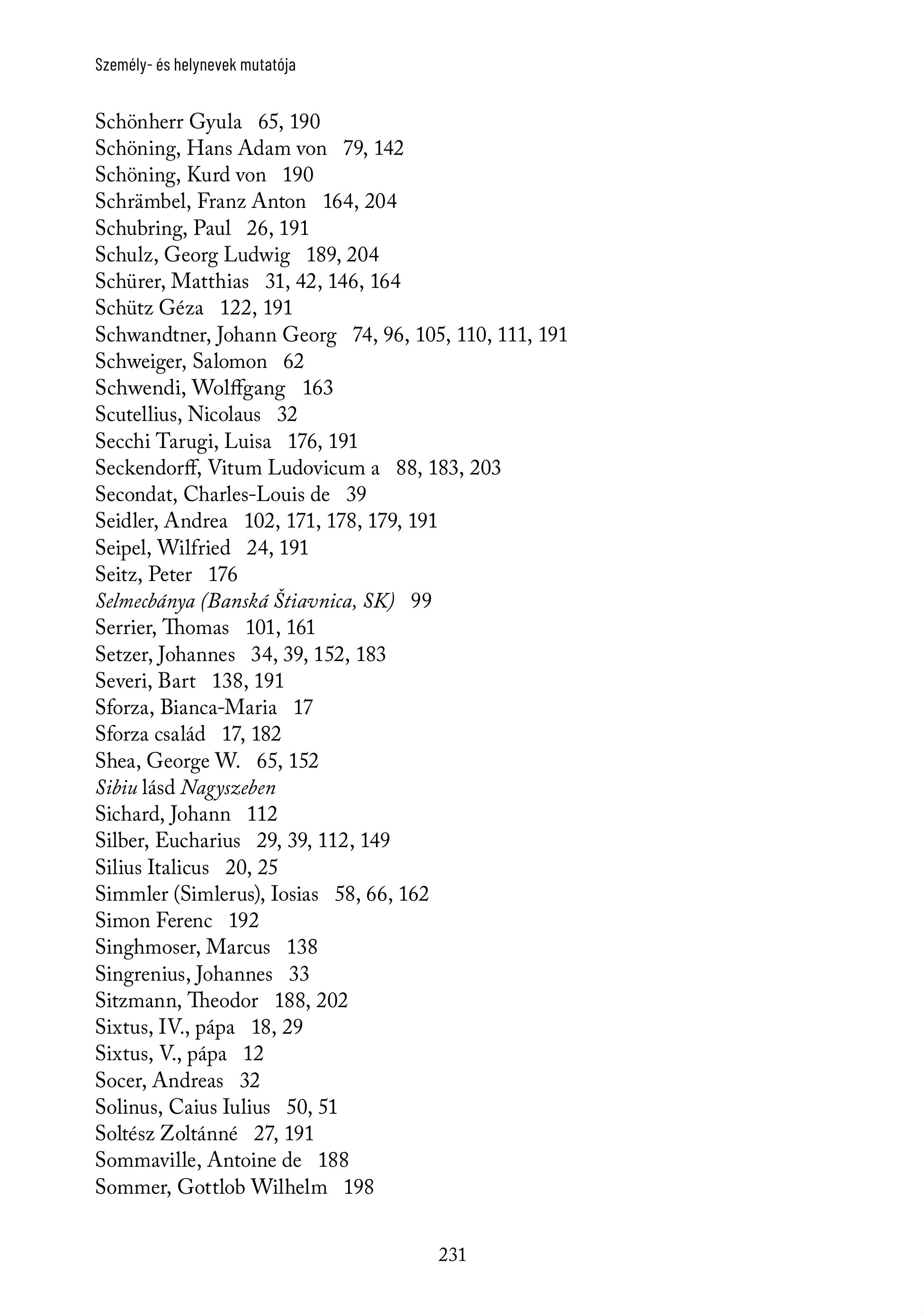 Személy- és helynevek mutatója Schönherr Gyula 65, 190 Schöning, Hans Adam von 79, 142 Schöning, Kurd von 190 Schrämbel, Franz Anton 164, 204 Schubring, Paul 26, 191 Schulz, Georg Ludwig 189, 204 Schürer, Matthias 31, 42, 146, 164 Schütz Géza 122, 191 Schwandtner, Johann Georg 74, 96, 105, 110, 111, 191 Schweiger, Salomon 62 Schwendi, Wolffgang 163 Scutellius, Nicolaus 32 Secchi Tarugi, Luisa 176, 191 Seckendorff, Vitum Ludovicum a 88, 183, 203 Secondat, Charles-Louis de 39 Seidler, Andrea 102, 171, 178, 179, 191 Seipel, Wilfried 24, 191 Seitz, Peter 176 Selmecbánya (Banská Stiavnica, SK) 99 Serrier, Thomas 101, 161 Setzer, Johannes 34, 39, 152, 183 Severi, Bart 138, 191 Sforza, Bianca-Maria 17 Sforza család 17, 182 Shea, George W. 65, 152 Sibiu lasd Nagyszeben Sichard, Johann 112 Silber, Eucharius 29, 39, 112, 149 Silius Italicus 20, 25 Simmler (Simlerus), Iosias 58, 66, 162 Simon Ferenc 192 Singhmoser, Marcus 138 Singrenius, Johannes 33 Sitzmann, Theodor 188, 202 Sixtus, IV., papa 18, 29 Sixtus, V., papa 12 Socer, Andreas 32 Solinus, Caius Iulius 50, 51 Soltész Zoltanné 27, 191 Sommaville, Antoine de 188 Sommer, Gottlob Wilhelm 198 231