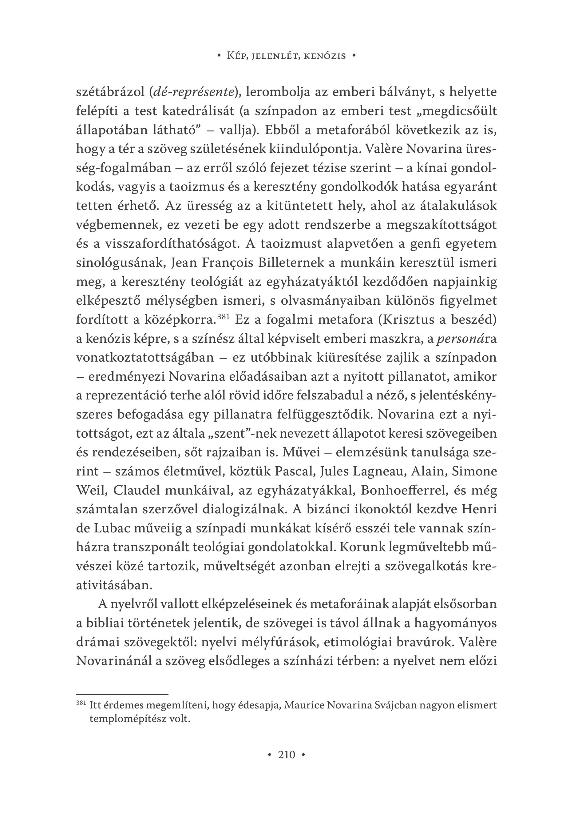 + KÉP, JELENLÉT, KENOZIS ? szétábrázol (dé-représente), lerombolja az emberi bálványt, s helyette felépíti a test katedrálisát (a színpadon az emberi test , megdicsőült állapotában látható" — vallja). Ebből a metaforából következik az is, hogy a tér a szöveg születésének kiindulópontja. Valére Novarina üresség-fogalmäban -— az erről szóló fejezet tézise szerint — a kínai gondolkodás, vagyis a taoizmus és a keresztény gondolkodók hatása egyaránt tetten érhető. Az üresség az a kitüntetett hely, ahol az átalakulások végbemennek, ez vezeti be egy adott rendszerbe a megszakítottságot és a visszafordíthatóságot. A taoizmust alapvetően a genfi egyetem sinológusának, Jean Francois Billeternek a munkáin keresztül ismeri meg, a keresztény teológiát az egyházatyáktól kezdődően napjainkig elképesztő mélységben ismeri, s olvasmányaiban különös figyelmet fordított a középkorra." Ez a fogalmi metafora (Krisztus a beszéd) a kenózis képre, s a színész által képviselt emberi maszkra, a personára vonatkoztatottságában — ez utóbbinak kiüresítése zajlik a színpadon — eredményezi Novarina előadásaiban azt a nyitott pillanatot, amikor a reprezentáció terhe alól rövid időre felszabadul a néző, s jelentéskényszeres befogadása egy pillanatra felfüggesztődik. Novarina ezt a nyitottságot, ezt az általa , szent"-nek nevezett állapotot keresi szövegeiben és rendezéseiben, sőt rajzaiban is. Művei — elemzésünk tanulsága szerint — számos életművel, köztük Pascal, Jules Lagneau, Alain, Simone Weil, Claudel munkáival, az egyházatyákkal, Bonhoefferrel, és még számtalan szerzővel dialogizálnak. A bizánci ikonoktól kezdve Henri de Lubac műveiig a színpadi munkákat kísérő esszéi tele vannak színházra transzponált teológiai gondolatokkal. Korunk legműveltebb művészei közé tartozik, műveltségét azonban elrejti a szövegalkotás kreativitásában. A nyelvről vallott elképzeléseinek és metaforáinak alapját elsősorban a bibliai történetek jelentik, de szövegei is távol állnak a hagyományos drámai szövegektől: nyelvi mélyfúrások, etimológiai bravúrok. Valére Novarinánál a szöveg elsődleges a színházi térben: a nyelvet nem előzi 381 Itt érjdemes megemlíteni, hogy édesapja, Maurice Novarina Svájcban nagyon elismert templomépítész volt. + 210 +