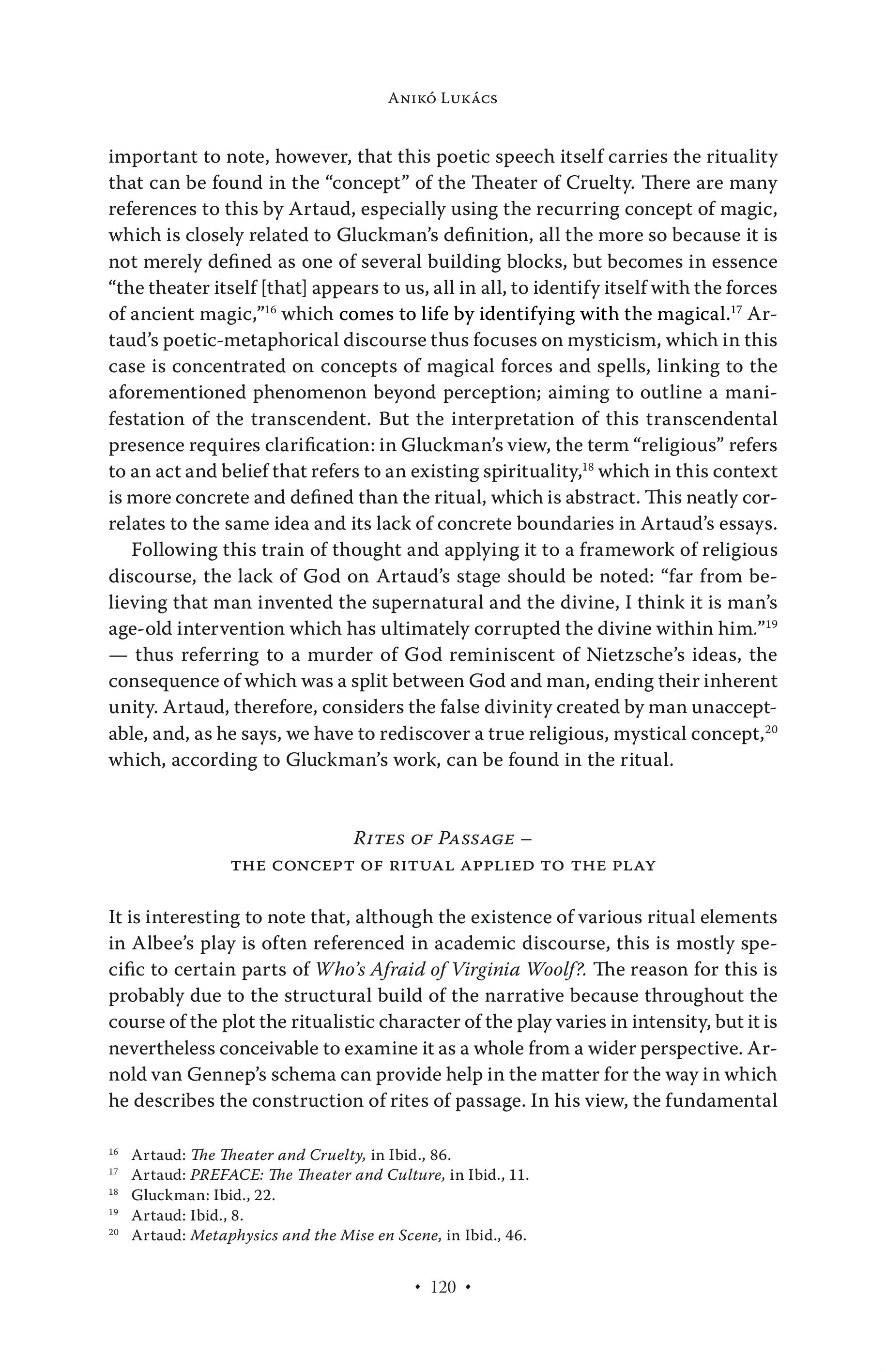 ANIKÓ LUKÁCS important to note, however, that this poetic speech itself carries the rituality that can be found in the “concept” of the Theater of Cruelty. There are many references to this by Artaud, especially using the recurring concept of magic, which is closely related to Gluckman’s definition, all the more so because it is not merely defined as one of several building blocks, but becomes in essence “the theater itself [that] appears to us, all in all, to identify itself with the forces of ancient magic," which comes to life by identifying with the magical.’” Artaud’s poetic-metaphorical discourse thus focuses on mysticism, which in this case is concentrated on concepts of magical forces and spells, linking to the aforementioned phenomenon beyond perception; aiming to outline a manifestation of the transcendent. But the interpretation of this transcendental presence requires clarification: in Gluckman’s view, the term “religious” refers to an act and belief that refers to an existing spirituality,'* which in this context is more concrete and defined than the ritual, which is abstract. This neatly correlates to the same idea and its lack of concrete boundaries in Artaud’s essays. Following this train of thought and applying it to a framework of religious discourse, the lack of God on Artaud’s stage should be noted: “far from believing that man invented the supernatural and the divine, I think it is man’s age-old intervention which has ultimately corrupted the divine within him.”” — thus referring to a murder of God reminiscent of Nietzsche’s ideas, the consequence of which was a split between God and man, ending their inherent unity. Artaud, therefore, considers the false divinity created by man unacceptable, and, as he says, we have to rediscover a true religious, mystical concept,”° which, according to Gluckman’s work, can be found in the ritual. RITES OF PASSAGE — THE CONCEPT OF RITUAL APPLIED TO THE PLAY It is interesting to note that, although the existence of various ritual elements in Albee’s play is often referenced in academic discourse, this is mostly specific to certain parts of Who’s Afraid of Virginia Woolf?. The reason for this is probably due to the structural build of the narrative because throughout the course of the plot the ritualistic character of the play varies in intensity, but it is nevertheless conceivable to examine it as a whole from a wider perspective. Arnold van Gennep’s schema can provide help in the matter for the way in which he describes the construction of rites of passage. In his view, the fundamental 16 Artaud: The Theater and Cruelty, in Ibid., 86. 17 Artaud: PREFACE: The Theater and Culture, in Ibid., 11. 18 Gluckman: Ibid., 22. 19 Artaud: Ibid., 8. 20 Artaud: Metaphysics and the Mise en Scene, in Ibid., 46. «120 +